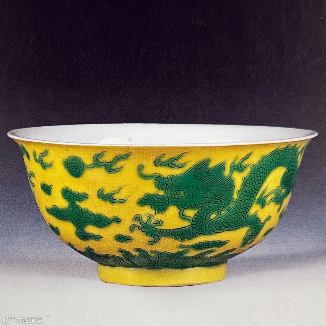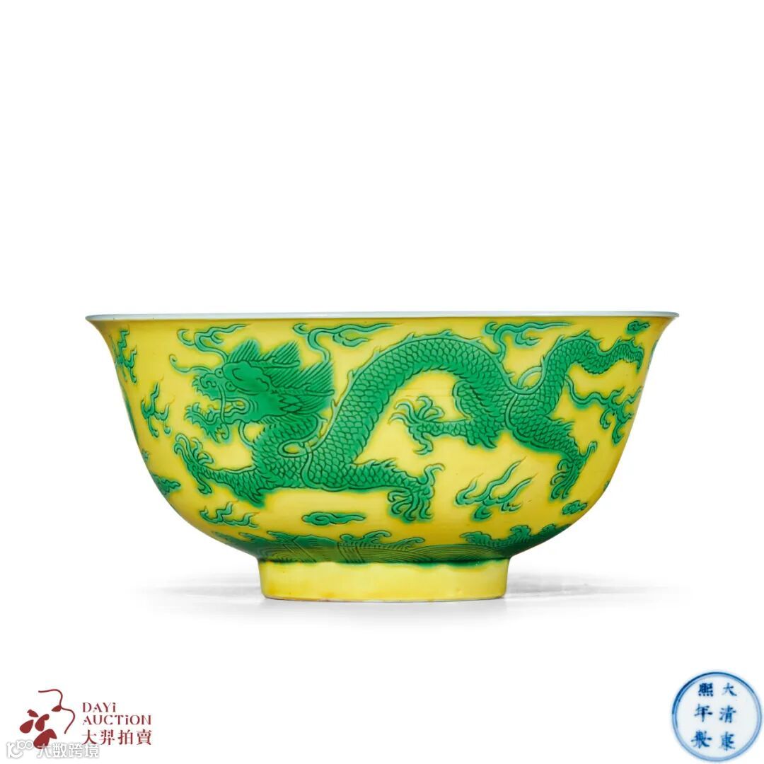 永乐年间,景德镇御窑已有试烧黄地绿龙纹,明官窑遗址永乐地层,曾出土同图纹之小壶,于涩胎之上刻画绿彩为饰,工艺特殊,需先于施釉之胎体上剔釉,显现龙纹涩胎,再于其上锥刻龙纹细节,高温复烧后于涩胎之上填绿彩,再以低温烘烧而成,工艺繁复,得两色皆美者并非易事,故历来为明清御窑之名贵品。此碗即为康窑黄地绿彩瓷之美者,外壁近足处饰海水江牙,主体通景装饰两条行龙于云火间追逐,动感十足,颇具皇家威严之气。碗底施白釉,以双圈内青花书“大清康熙年制”六字双行楷书款。传世同类器,可见南京博物院藏例。
