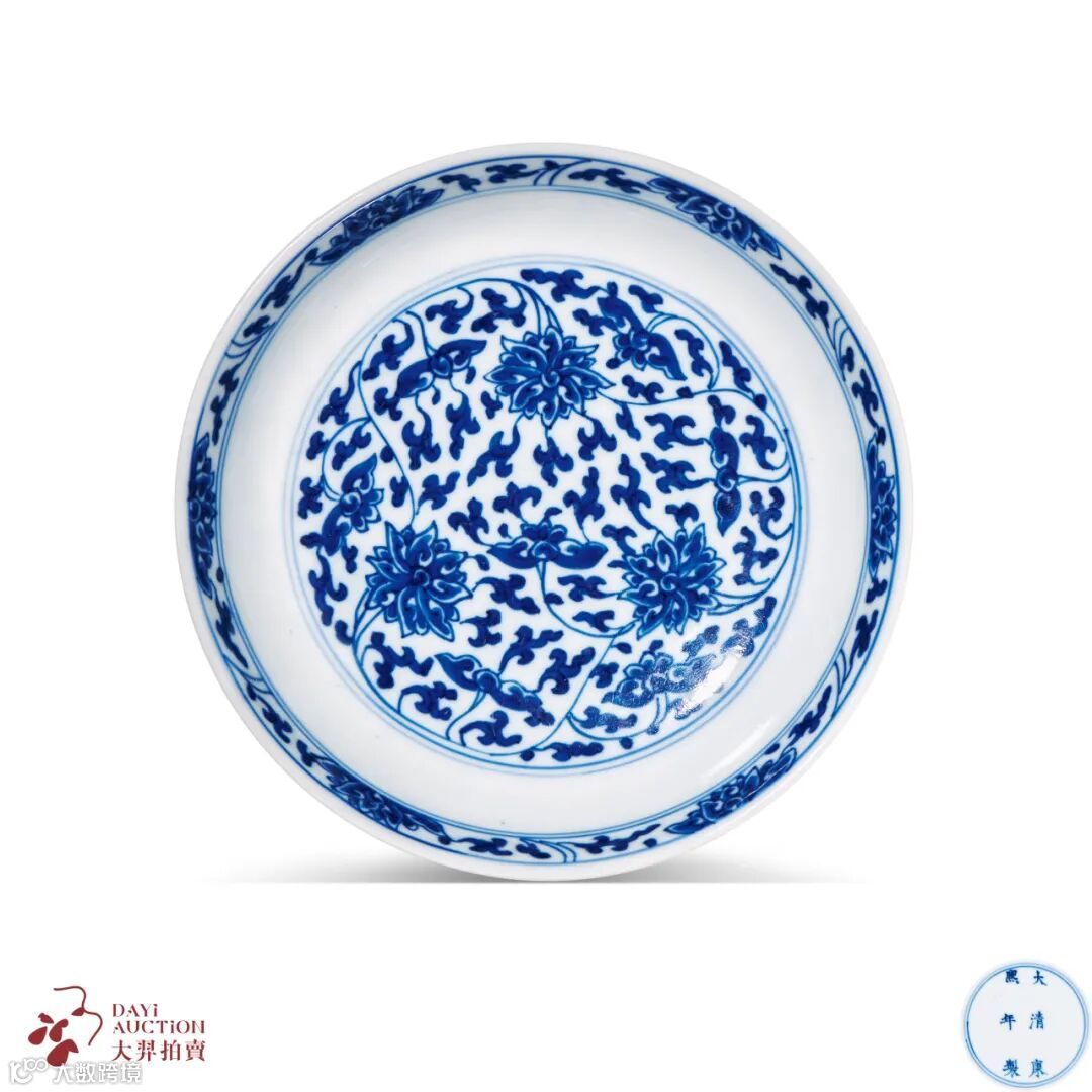 此盘撇口,浅弧腹,圈足。内外青花彩绘缠枝莲纹,花头为西番莲,体型较大,盘心中三只莲花围绕在一朵侧莲周围。莲叶婉转缠绕,繁密细腻。盘心图案外围以双圈线为廓,盘内壁装饰一圈侧面花头的缠枝莲纹。盘外壁的缠枝莲,花硕而叶稀,主次分明。此青花盘,造型规整,青花发色翠亮,釉面莹润,是不可多得的康熙官窑佳品。