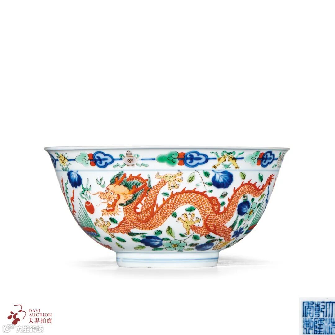 内口沿有青花弦纹两道,碗心青花双圈内绘红彩云龙纹。主题纹饰寓意“龙凤呈祥”,《孔丛子·记问》:“天子布德,将致太平,则麟凤龟龙先为之呈祥。”后以“龙凤呈祥”指吉庆之事。据清宫档案记载,此类碗应为皇帝大婚典礼和乾清宫家宴上所用之器。五彩龙凤呈祥碗,在《国朝宫史》中记载为“五彩红龙瓷碗”始见于康熙朝,此后历朝至晚清均有烧制。
