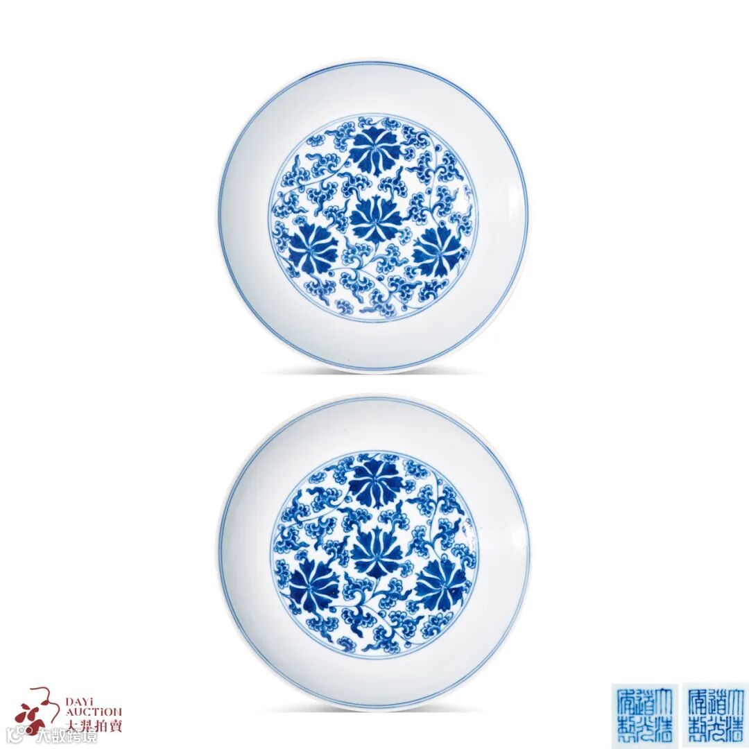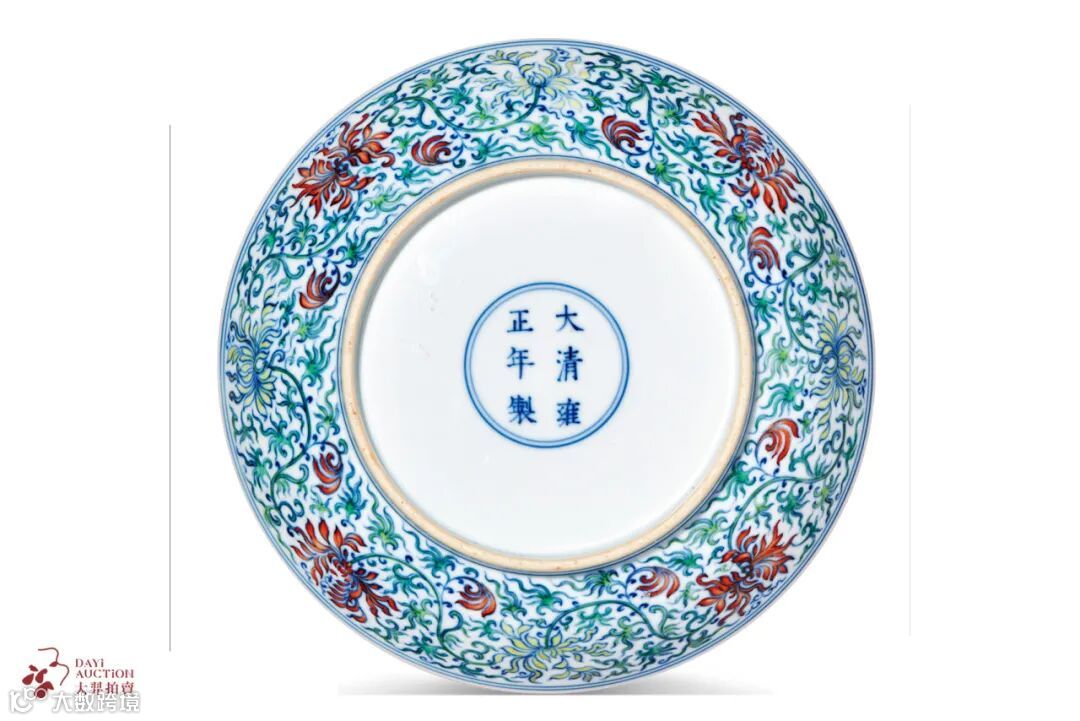 拍品形制及纹饰与南京博物院藏清雍正青花缠枝苜蓿花纹盘相同,有青花及斗彩两种制式。造型简洁,修胎利落,胎体轻薄,胎质精实,釉色莹润如玉。通体以斗彩工艺绘缠枝苜蓿花纹,纹饰构图合理,描绘精细,所绘苜蓿花新颖别致,融中西美学於一体,釉下青花与釉上诸彩相互掩映,华美瑰丽。整器构图疏朗,画工清雅,实为雍正官窑斗彩之精品