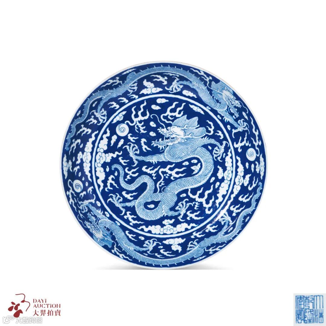 青花地留白云龙赶珠纹盘