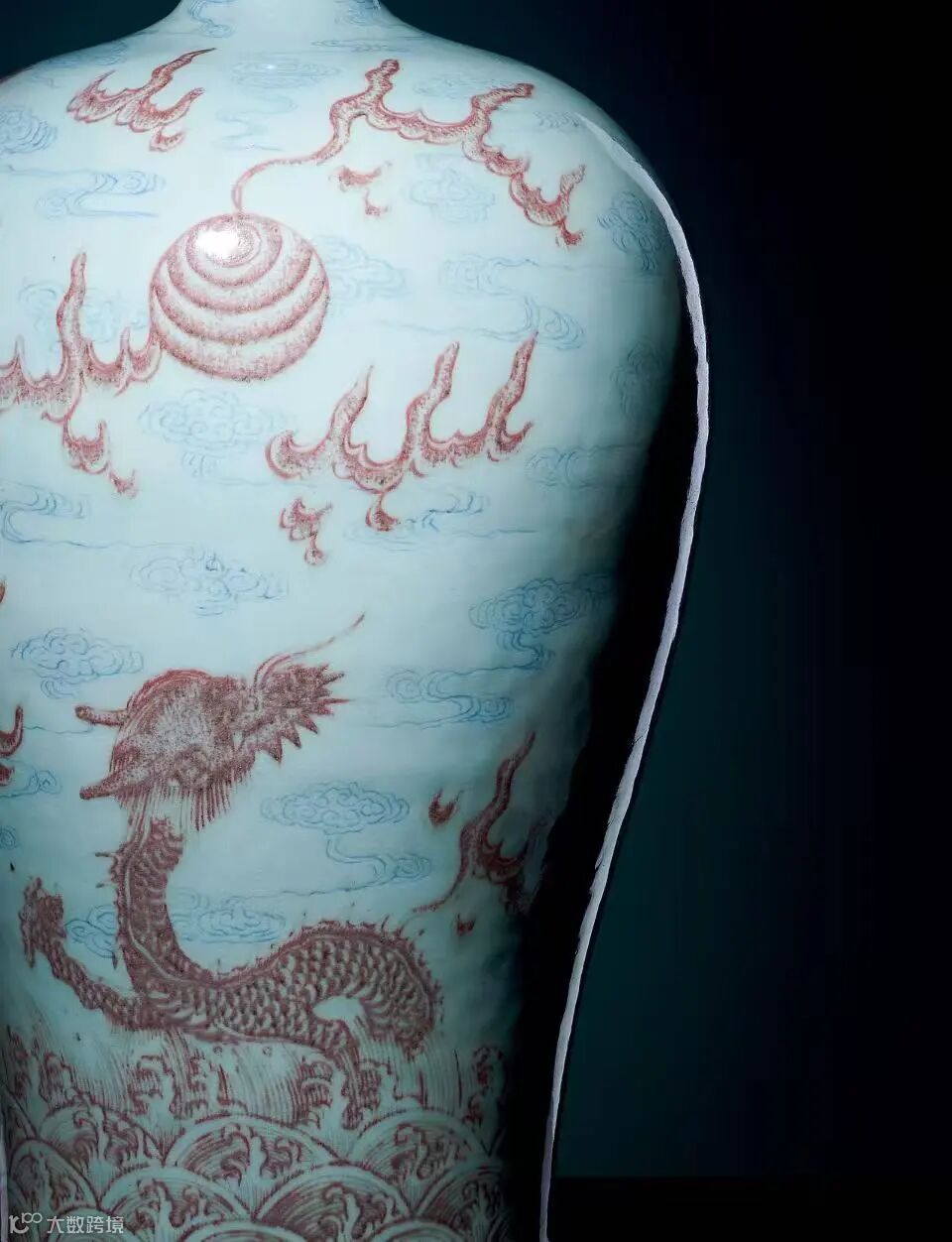 梅瓶器形高大,胎体厚重,颈部较细长。外壁通景绘苍龙教子图,以隐青工艺饰祥云,釉里红绘双龙和海水,苍龙身姿矫健,五爪锋利,胫部海浪汹涌,幼龙跃出海面,与苍龙彼此呼应,父子情深溢于言表。