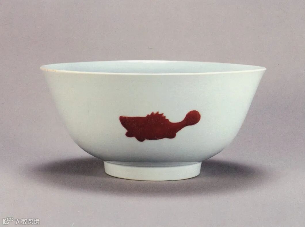 此式三鱼纹肇始于明代,因铜红釉烧造难度较大,可得色泽鲜妍者甚少,故这类作品素为明代官窑之名贵品种,清雍正御窑承袭此纹饰之余,以完美之白釉与铜红釉相映,更胜前朝。