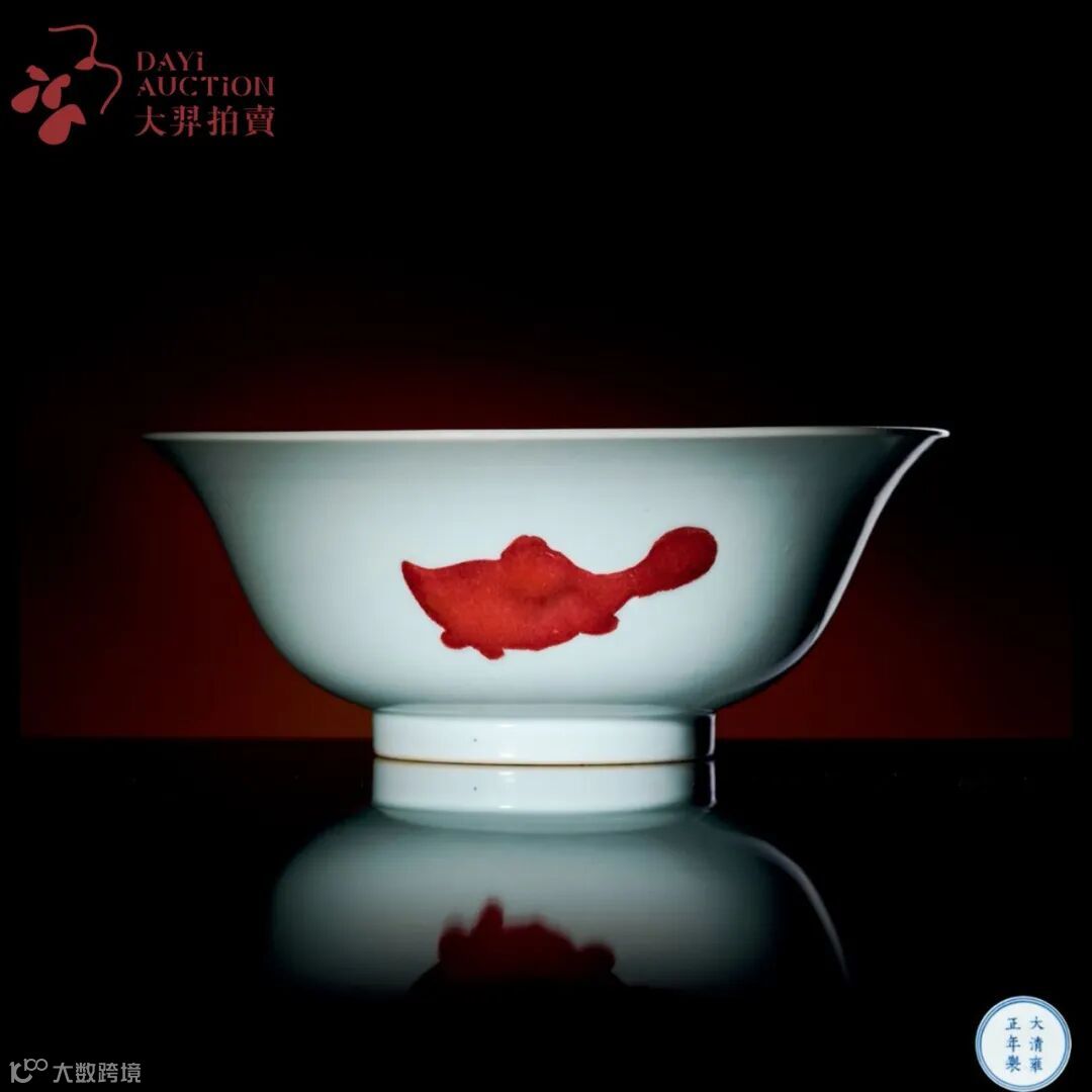 碗外壁以填红工艺作鳜鱼三尾,寓意“富贵有余”,内壁光素无纹,三鱼生动灵活,潜于水中,若隐若现,意蕴朦胧,极具写意之神韵。底足内青花双圈“大清雍正年製”六字双行楷书款。