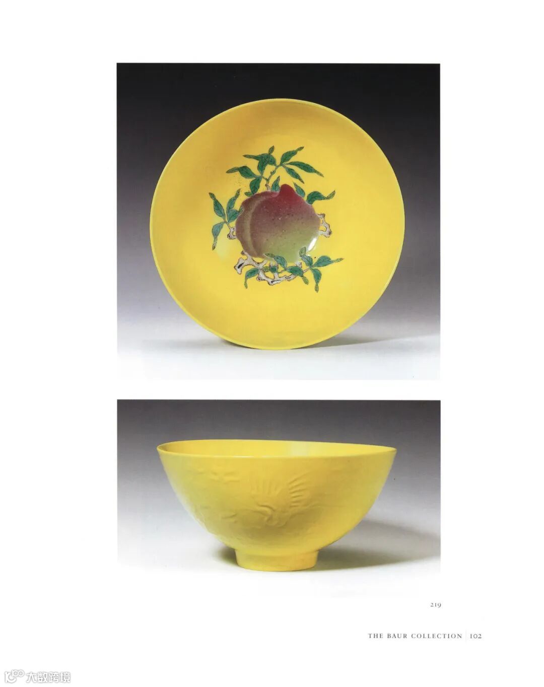 附图:瑞士鲍尔藏 清雍正 柠檬黄釉外模印云鹤祝寿内粉彩折枝仙桃纹大碗