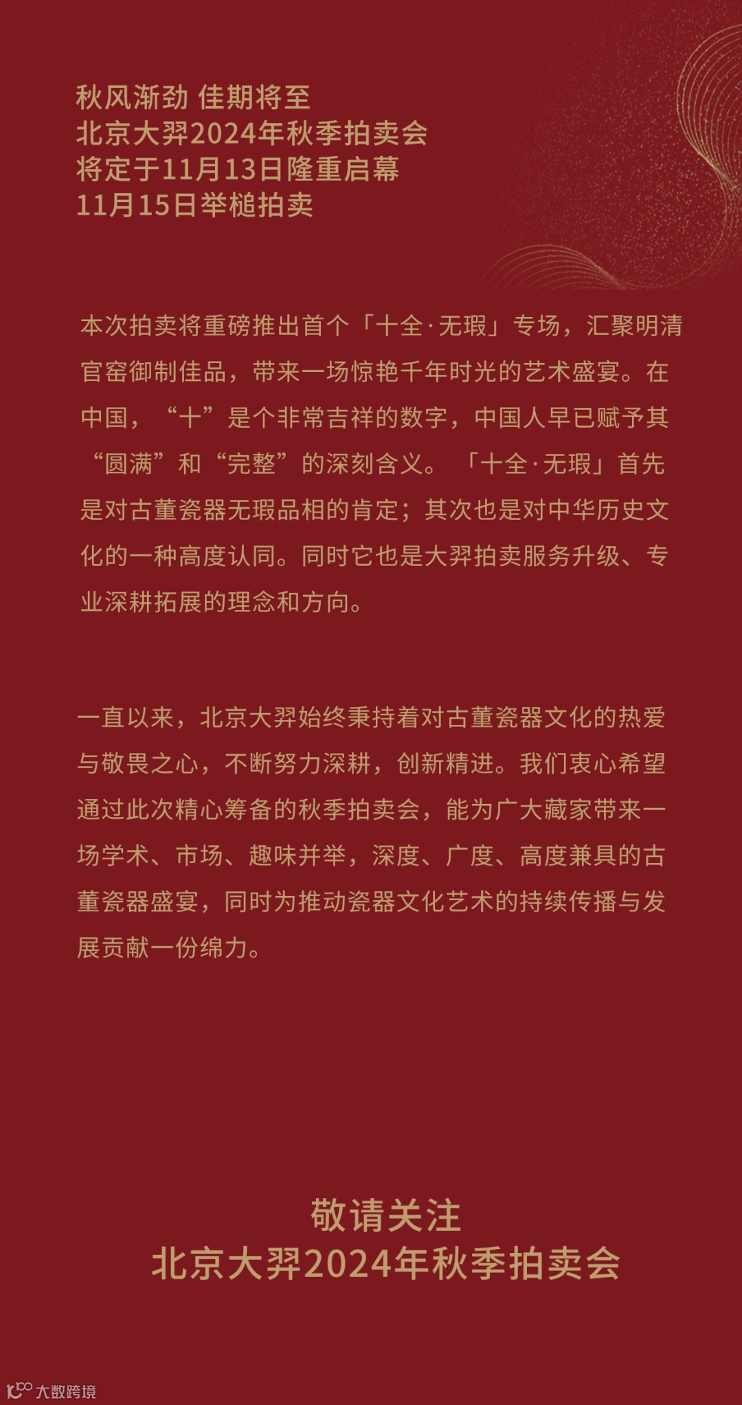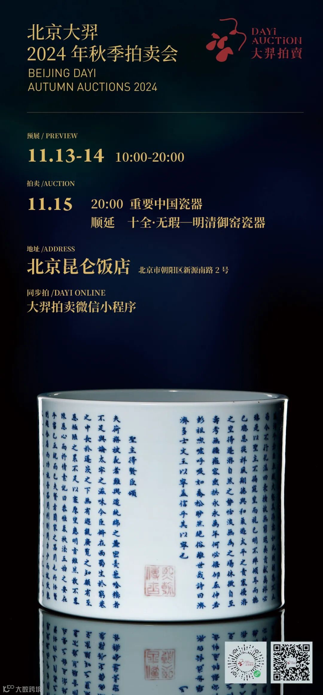 北京大羿拍卖创立于2017年,深耕明清瓷器,以“无瑕”为理念,致力于给全球广大藏家带来至臻至美的收藏体验。