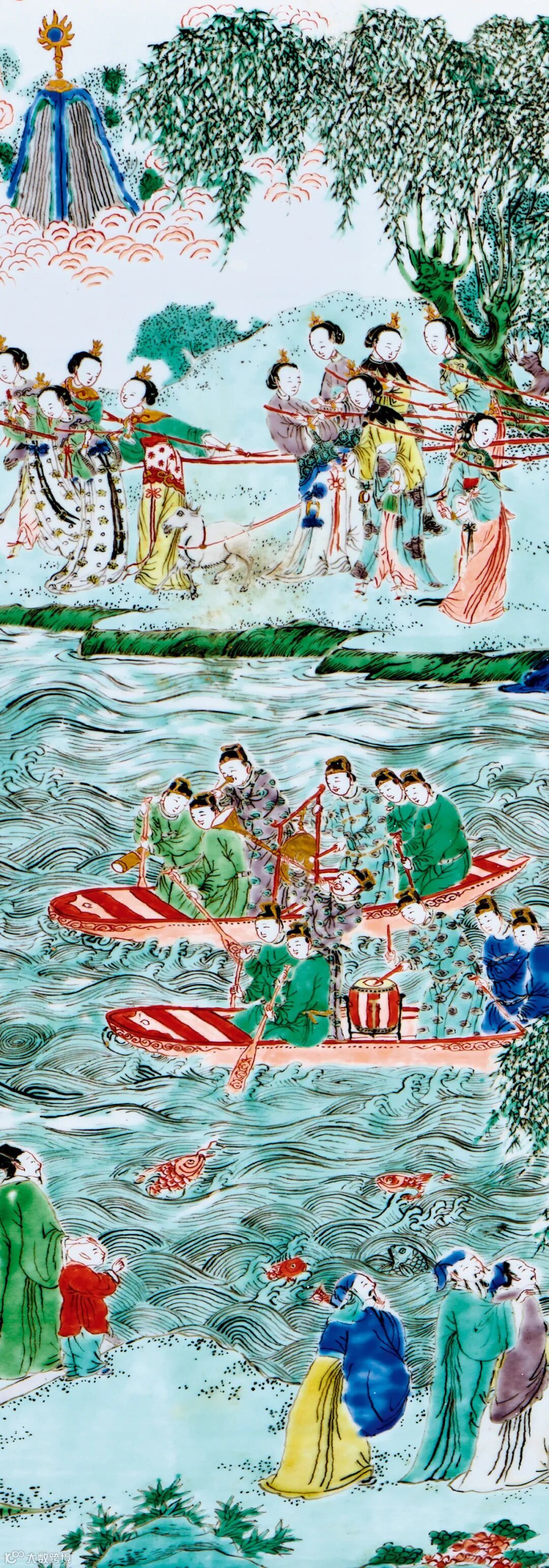 本品盘口直颈,筒腹及底内收,下承圈足。通体施透明釉,釉面清润怡人。釉上以五彩为饰,腹部通景绘“隋炀帝幸江都”故事图。人物形象刻划逼真,画工精致而笔触流畅,艺术表现力极强。加上画面上人物、景物的颜色浓淡深浅不一,富有层次感和意境感,让人在视觉上得到美的享受,似乎无穷韵味蕴含其间。