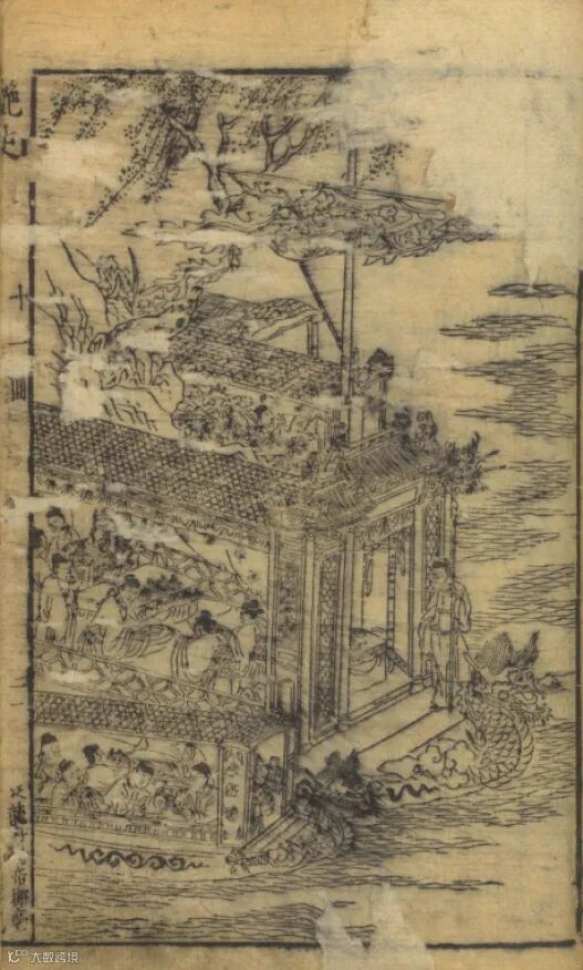 画面中河流波浪翻滚,御舟行驶于浪花之间,岸上众多“殿脚女”与羊拉纤,龙舟头尾各有侍女奋力划桨,隋炀帝端坐龙舟欣赏风景,众宫女吹拉弹唱,以娱炀帝。岸上行人众人齐聚岸上围观,市井民夫、仕女儿童皆摩肩擦踵,探头观望,交头接耳,场面热闹非凡。此举盛况在明末人瑞堂刊本《通俗演义隋炀帝艳史》第十一回“泛龙舟炀帝挥毫 清夜游萧后弄宠”中也有体现。