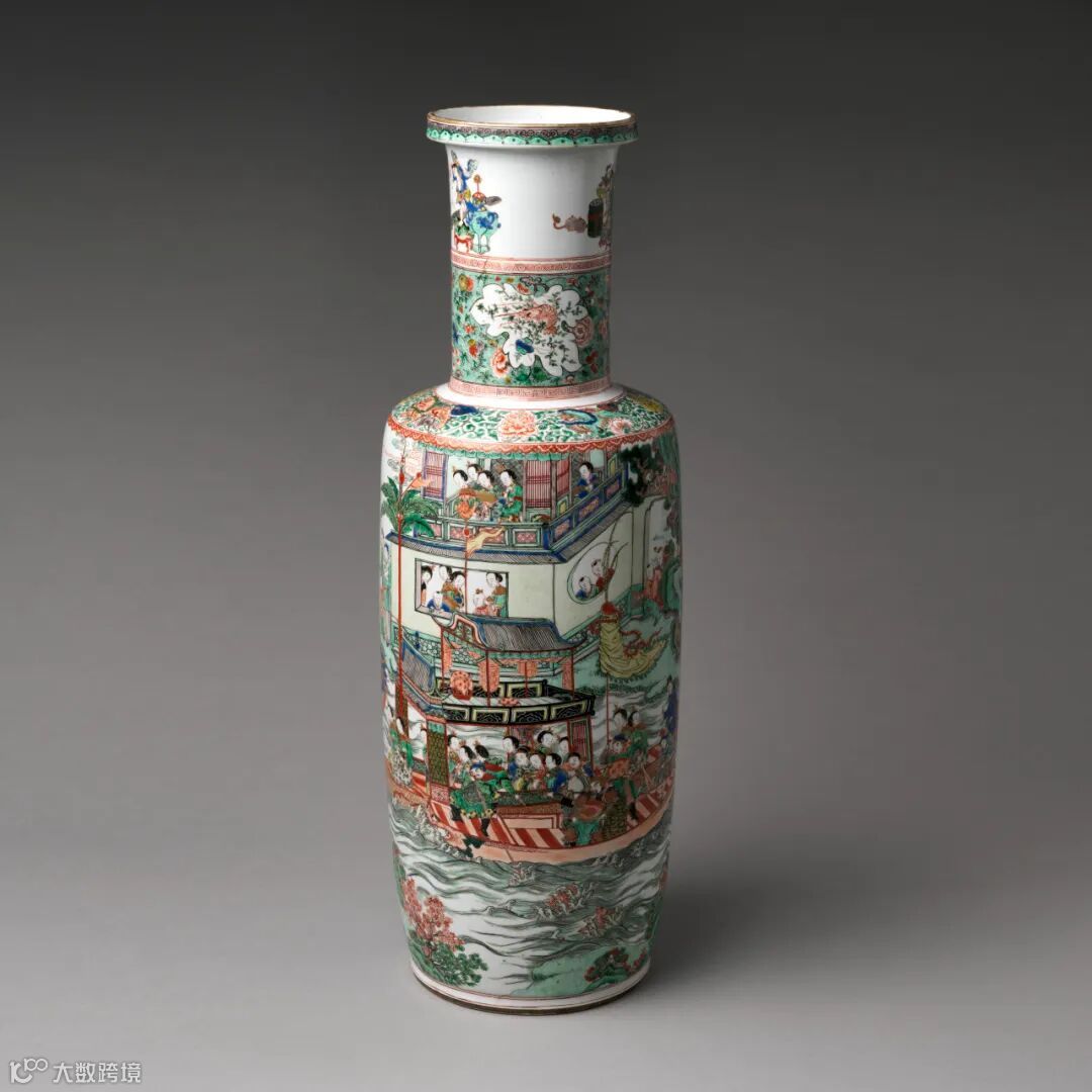 纵观清康熙 五彩“炀帝幸江都”故事图大棒槌瓶,无论是胎釉、画工、造型还是色彩都具备康熙五彩器的特征,五彩发色艳丽有加,彩饰丰富,色彩亮丽,堪称熙朝五彩上品。良工巧制,虽人物众多,却姿态各异,精彩纷呈,极其难得,仅一例可比,现藏于美国大都会博物馆;另见天津博物馆藏有纹饰相近之藏品,可作参阅。