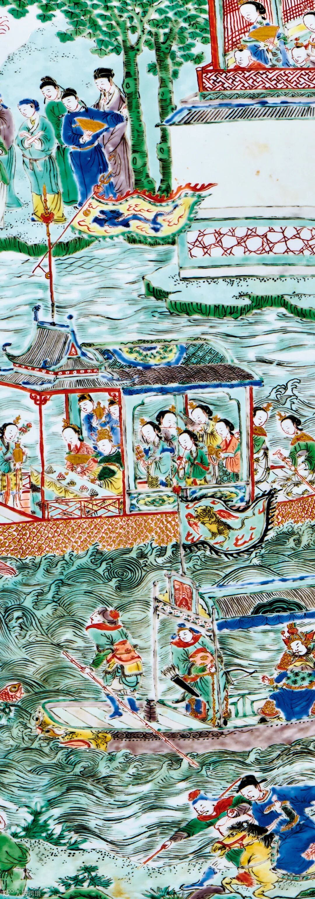 康熙五彩是清代彩瓷中的名品,享有极高的声誉,素有“康彩恢奇”、“康熙彩硬”之品评,与柔和清新之感的粉彩迥然不同,色彩浓艳却又承载了诸多寓意。在与其他名窑口、戏曲小说、诗书画印的互动中,陶瓷画师内心的细腻表达,一览无余。