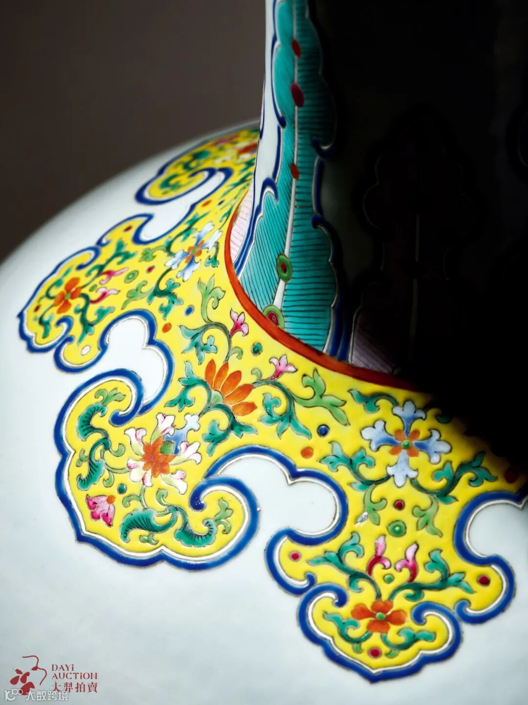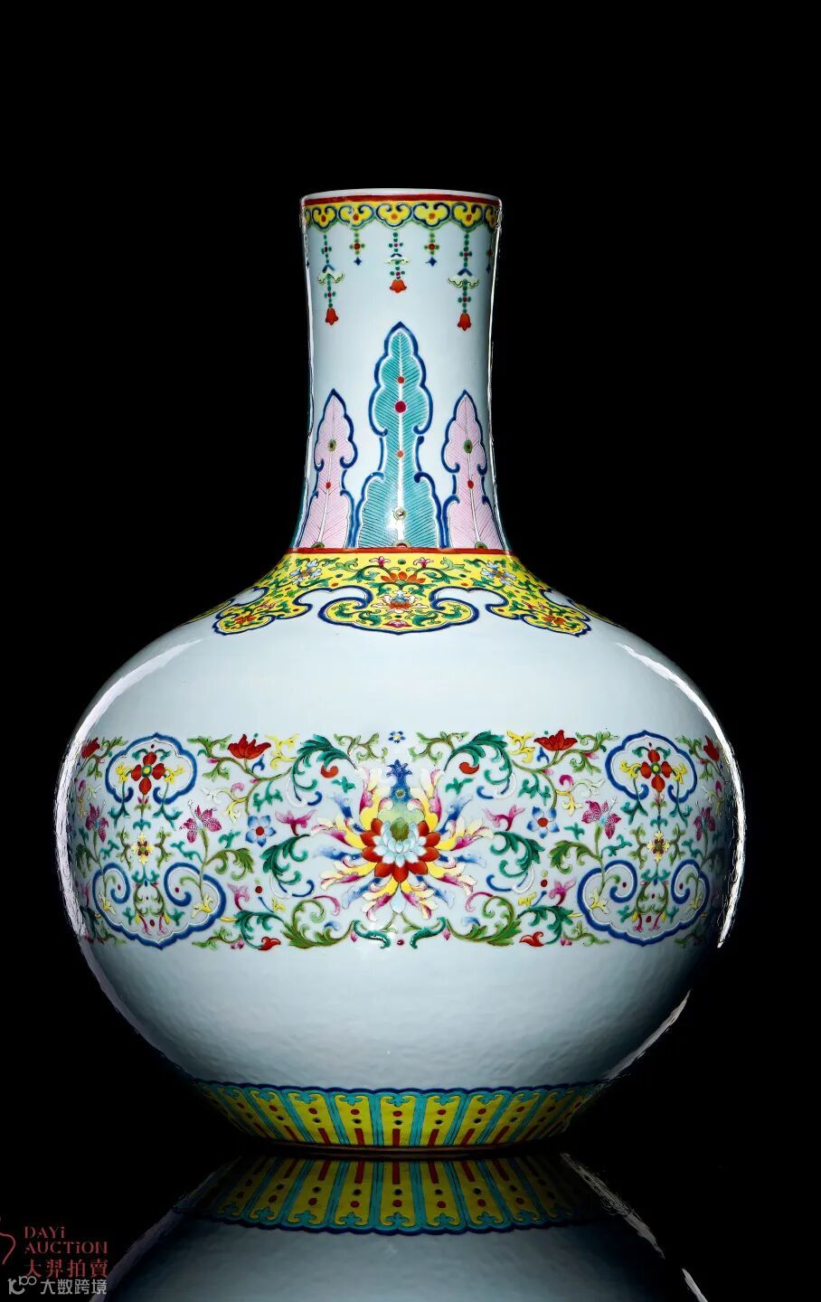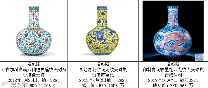 乾隆一朝,可见各式釉彩、纹饰类天球瓶,备受市场追捧,2018年香港佳士得曾以成交价1.306亿港币释出斗彩加粉彩暗八仙缠枝莲纹天球瓶。而本只LOT36清乾隆 御制洋彩缠枝西番莲纹天球瓶在工艺审美角度与斗彩相比也不遑多让。