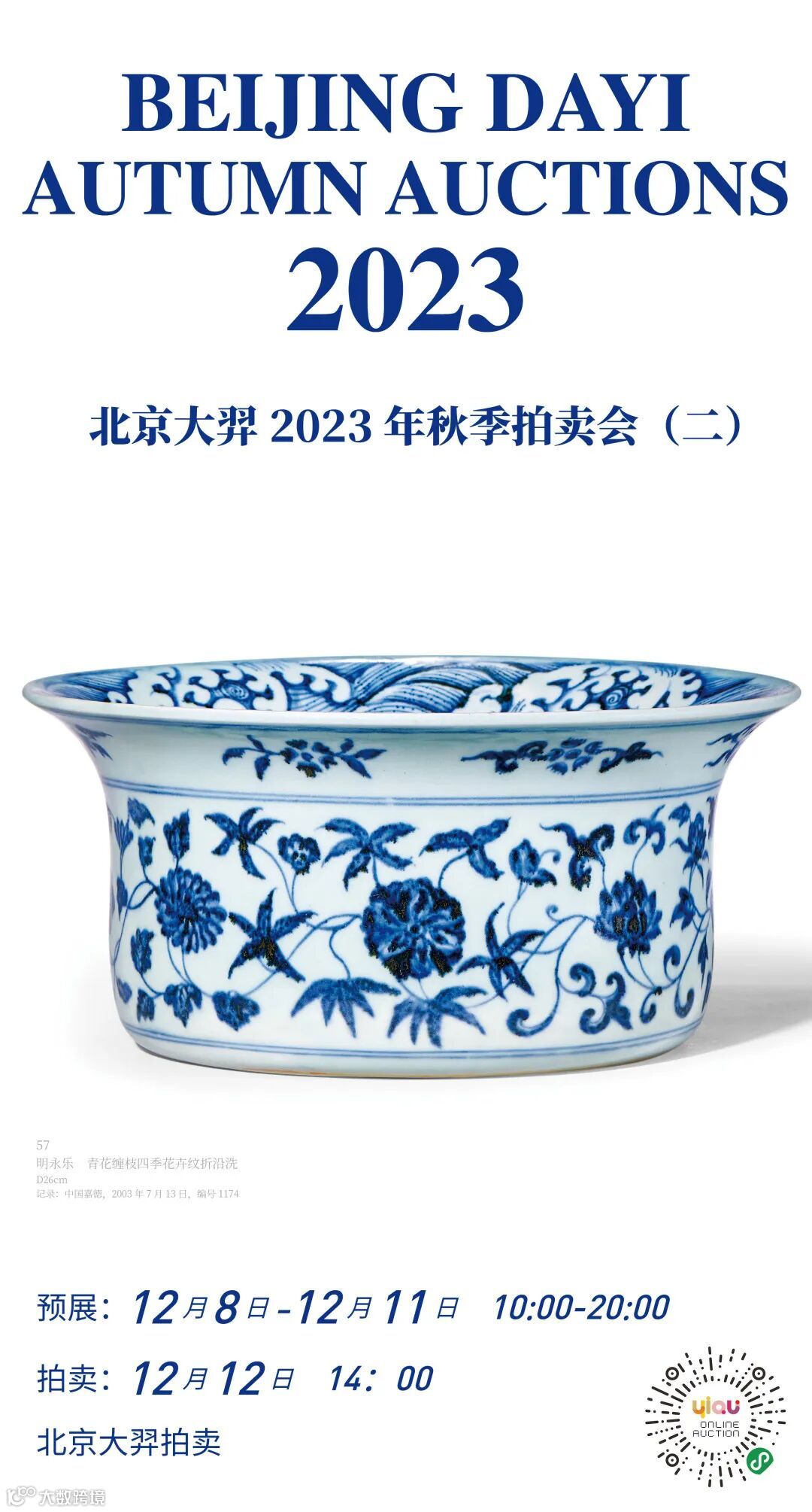再加之,明成祖永乐皇帝尤重瓷艺,引领御窑瓷器成为空前绝后的艺术典范,开创之功甚伟,隽品迭出,尤为精绝,其中青花一项,色泽深翠,式样精妙。本次2023年秋拍(二)重要拍品——Lot57 明永乐 青花缠枝四季花卉纹折沿洗。