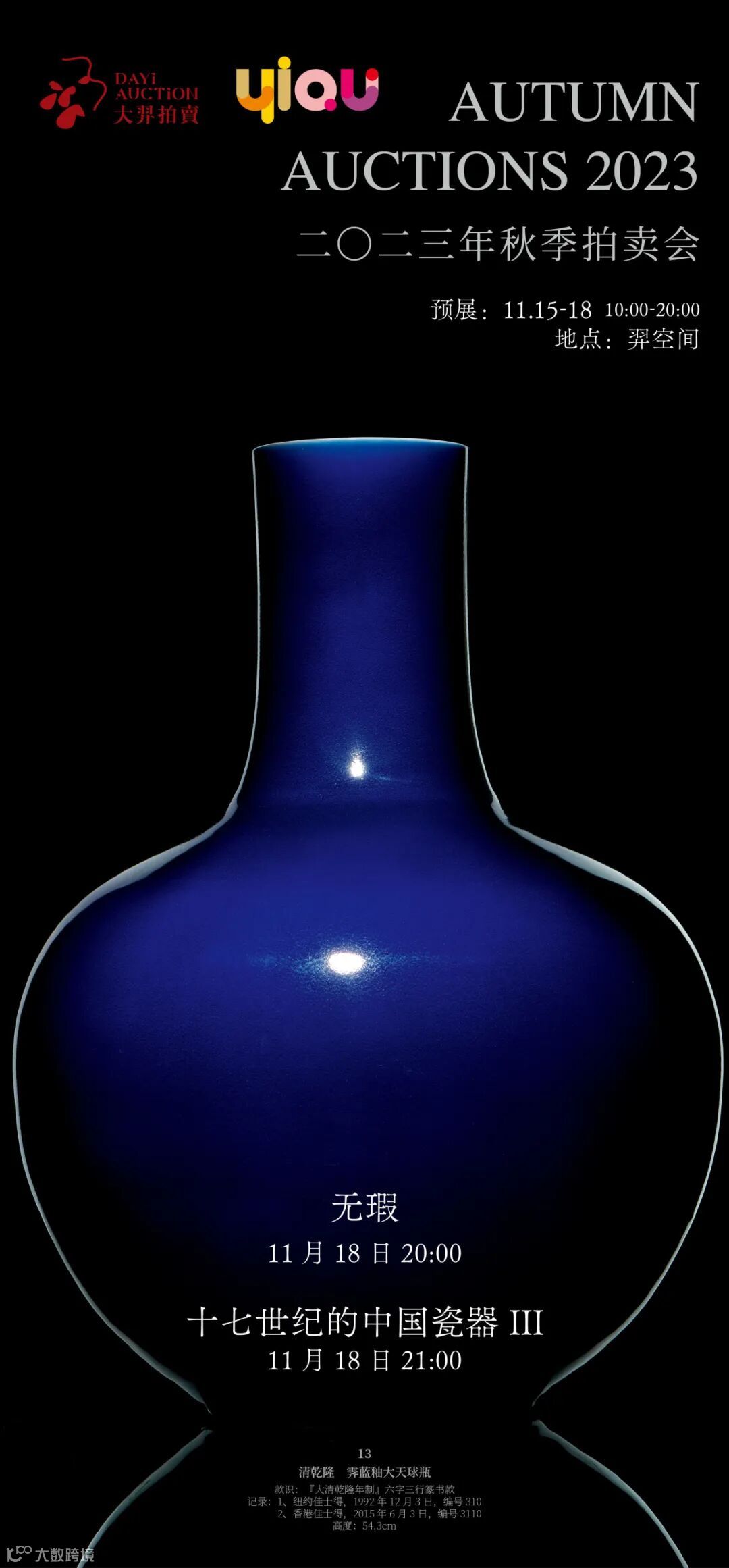 金风过爽, 雁过留声。二〇二三年秋季拍卖会已盛大开幕,此次秋拍汇聚众多收藏家和艺术爱好者共同见证「无瑕」、「十七世纪的中国瓷器Ⅲ」两大专场的艺术之美。