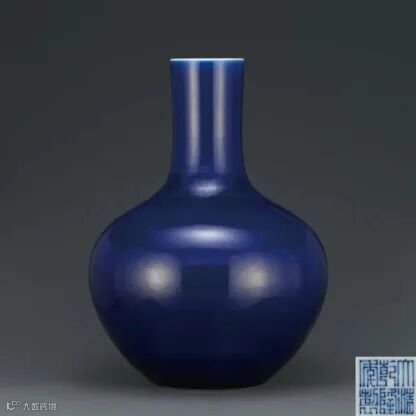 本品长颈,鼓圆腹,圈足,器型恢宏大气,线条圆润饱满。外壁通施霁蓝釉,匀净明亮,苍妍夺目,一如宣窑宝石蓝之绚烂,口沿一线灯草口,为整器平添几分宁谧之气。器底施白釉,中心青花书 “大清乾隆年制”六字篆书款,字体端庄大气,结构工整秀丽。