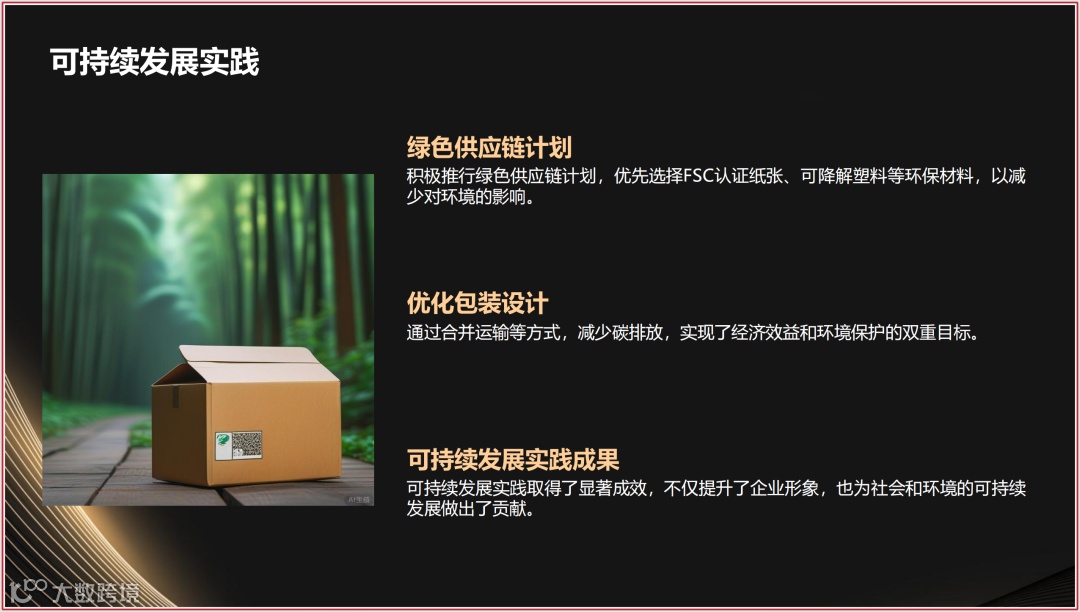 - 通过优化包装设计、合并运输等方式,年均减少碳排放超200吨。
