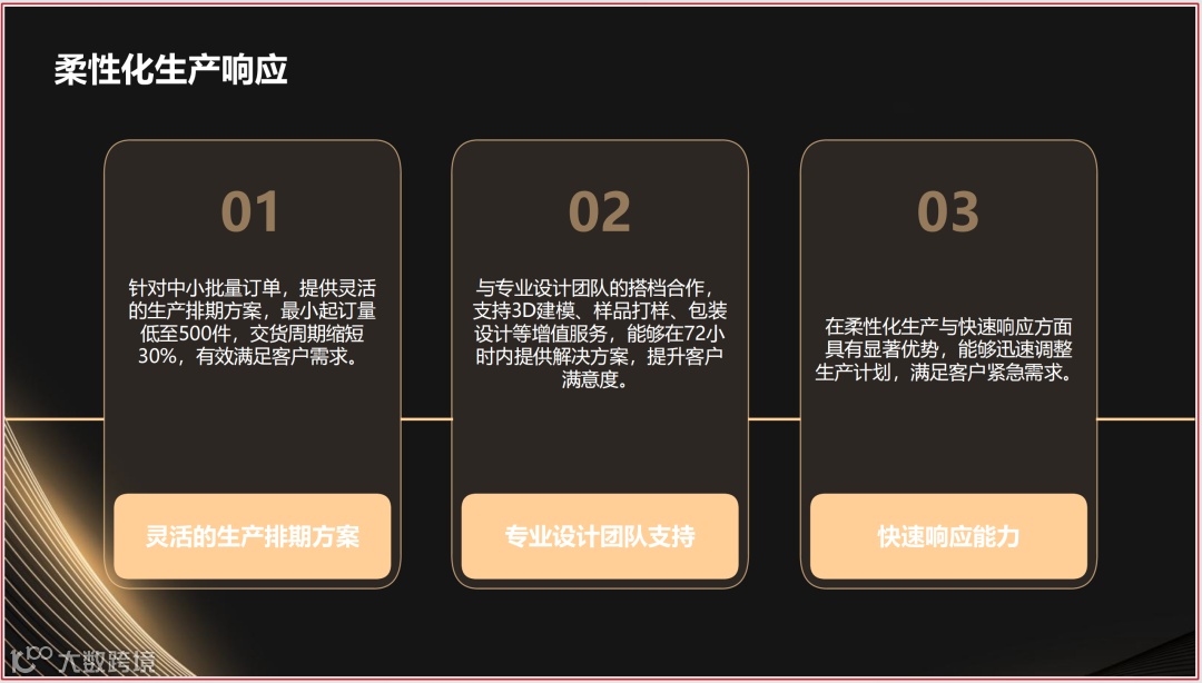 - 针对中小批量订单,提供灵活的生产排期方案,最小起订量低至500件,交货周期缩短30%。