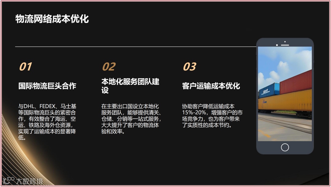 - 与DHL、FEDEX、马士基等国际物流巨头合作,整合海运、空运、铁路及海外仓资源,降低客户运输成本15%-20%。