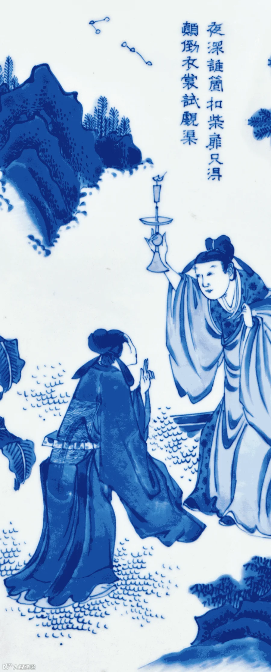 瓶身画意诗文,为《红拂记》之“夜奔”典故。与明末玩虎轩刊本《红拂记》之“夜奔”一幕所绘颇为相似。一代名将李靖于隋末在长安谒见司空杨素,为杨素家伎红拂所倾慕,并随之私奔。瓶身所绘高举烛台的清秀男子为李靖,女扮男装者为红拂女。二人彼此顾盼、含情脉脉、难以分离的感情跃然瓷上。其余假山垂柳、古井栏杆、山石芭蕉在夜色深深中显得恬淡深幽。
