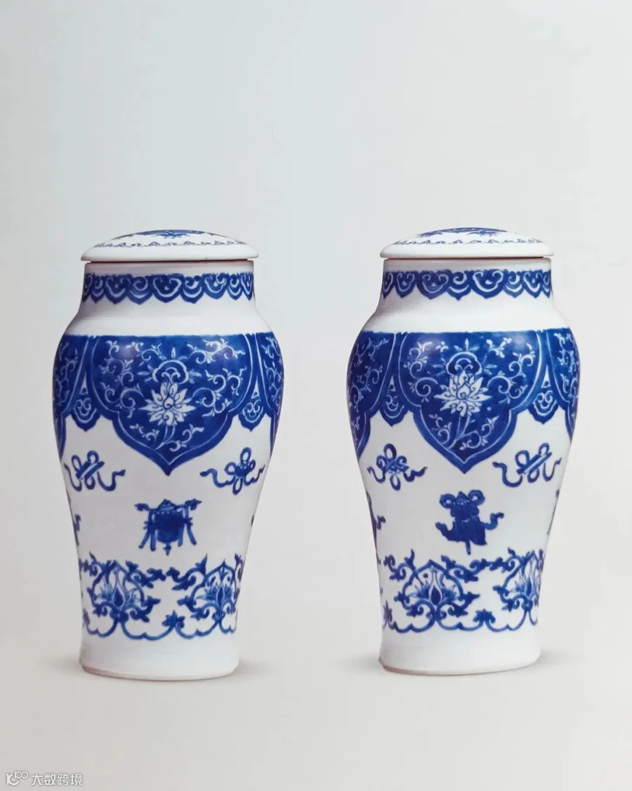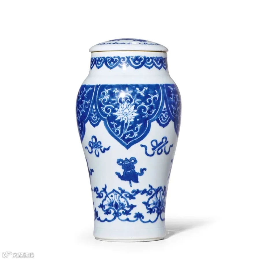 拍品为典型崇祯时期佳作,丰腴秀美,形制端庄周正。罐直口,短颈,圆腹,近底微外撇,圈足,盖面拱起,子母口。通体施白釉,釉面润泽,通体以青花绘饰,器盖设一周如意卷草纹,内绘一朵盛开宝相花,间以五组莲纹。