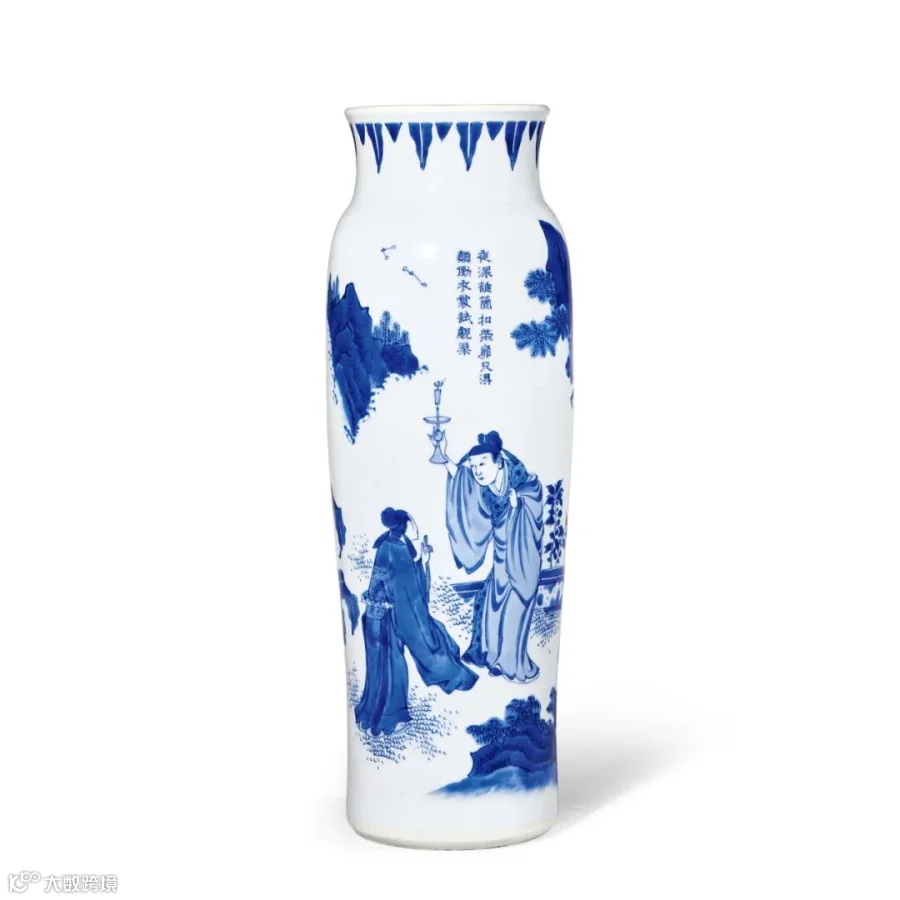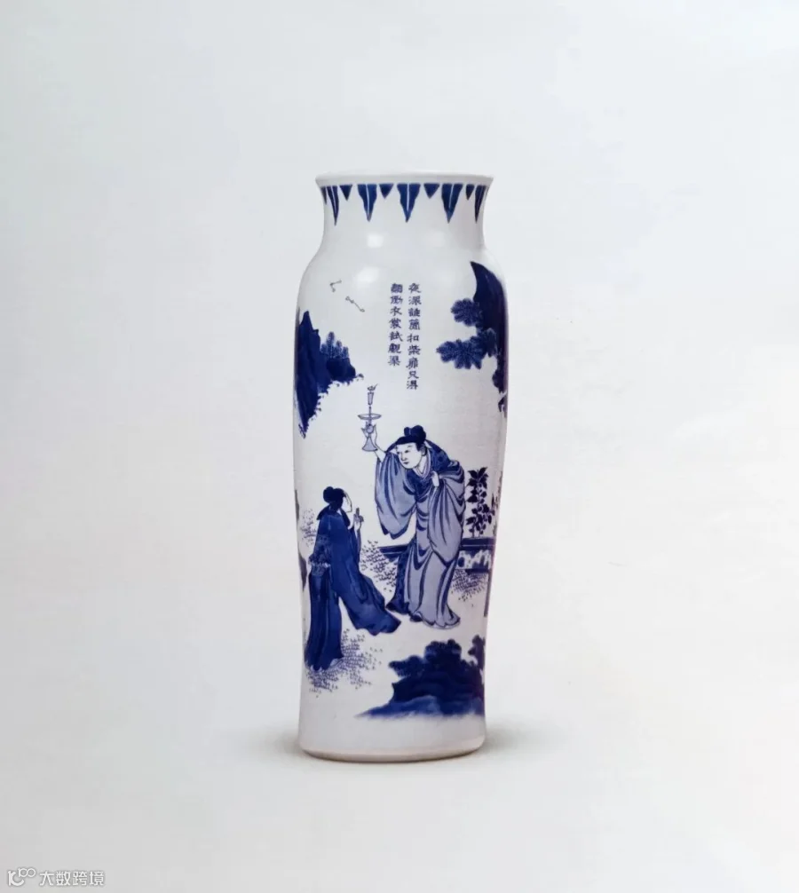 筒瓶撇口束颈,长筒形腹。口沿绘蕉叶纹,肩部暗刻弦纹。筒身通景绘制人物树木,北斗迤明、山横叠翠。一位男子面容清秀,头戴唐巾,身着长袍,高举烛台,探询前方。男子对面伫立者,虽亦冠巾着袍,却身形娇小,应为红粉英雌。筒身空白处题诗:“夜深谁个扣柴扉,只得颠倒衣裳试觑渠。”