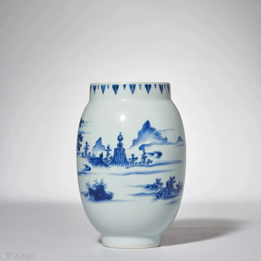 明末清初瓷器制作展现出全新的时代风貌,题材之特别、内容之丰富,均开一代未有之奇,尤其瓷质文房用具以其多样化的造型、丰富多彩的纹饰而流行一时,案缸成为文人案头不可或缺之物。本品敞口,深腹,平底,造型秀丽古雅,胎体厚重。