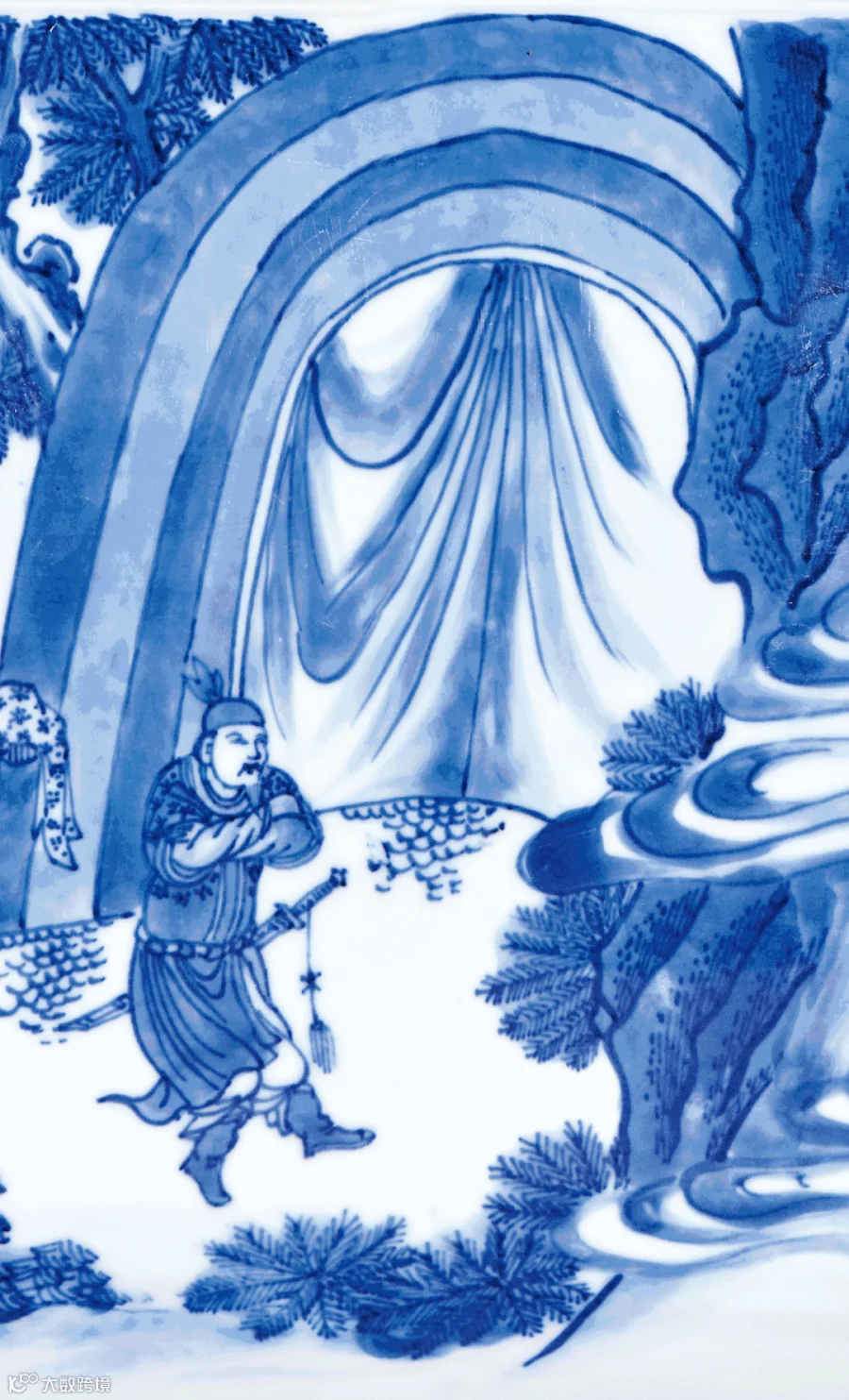 器身所绘画意,为元代成吉思汗与长春真人丘处机“龙马相会”典故。“龙马相会”影响深远。长春真人为天下苍生远行万里,无惧天险,获“一言止杀之功”。成吉思汗亦倾心相知:“循循道诲,敬闻命矣,斯皆难行之事,然则敢不遵?依仙命勤而行之”。一帝一道,智勇相交,成千古佳话。整器绘画精妙流动、婉丽工致,画意苍茫寥廓、意境清奇,为明代晚期景德镇窑制器佳作。