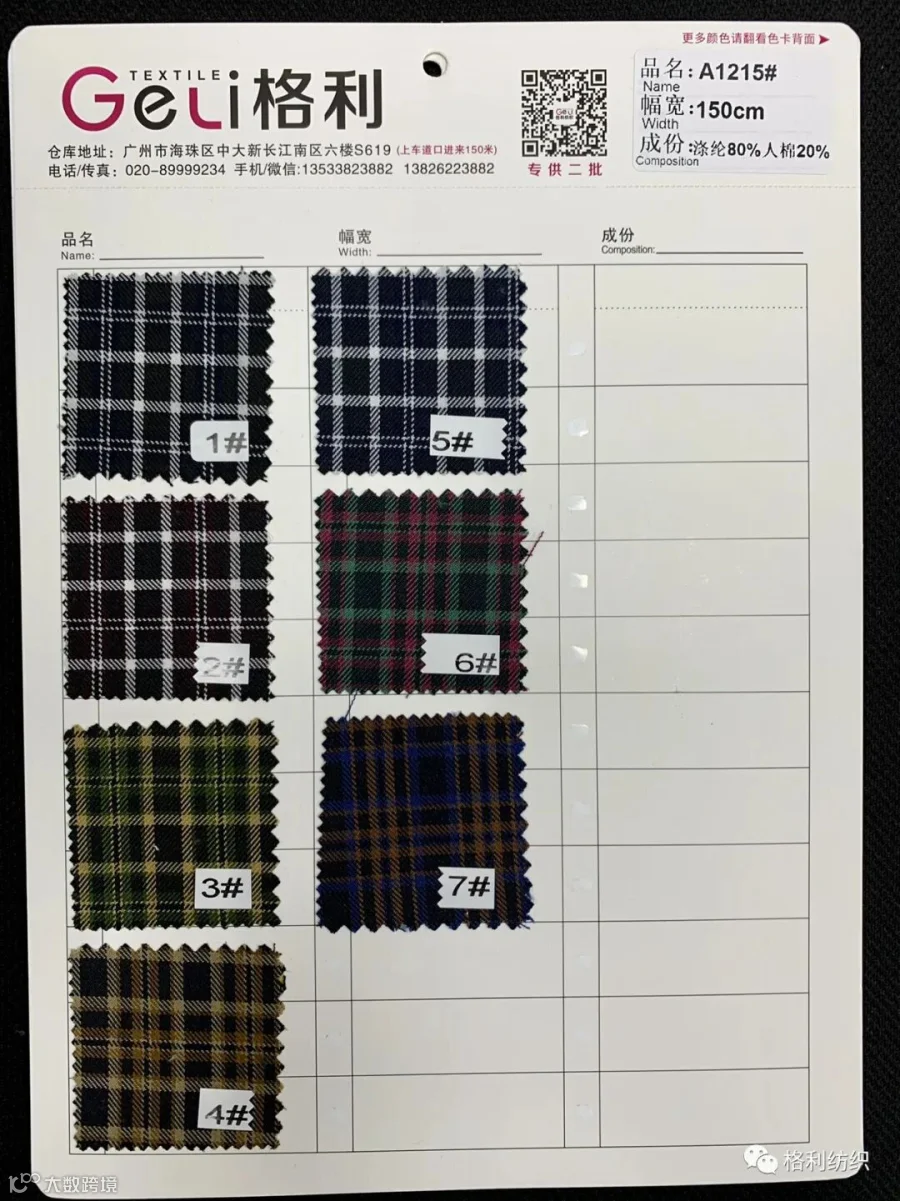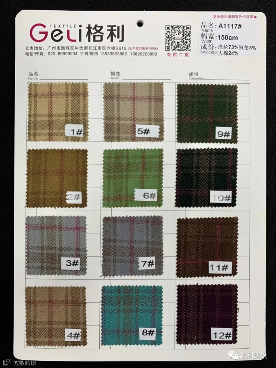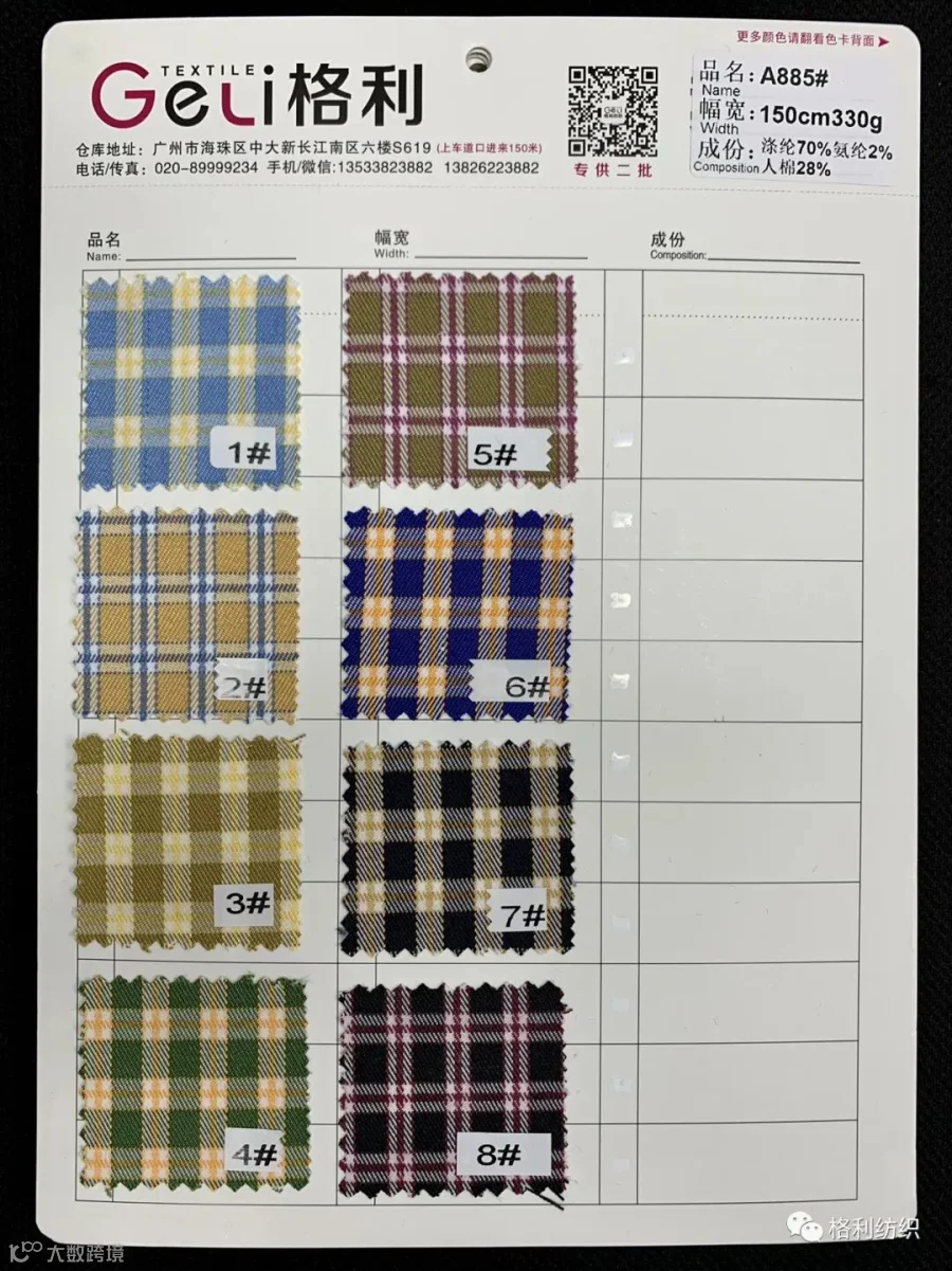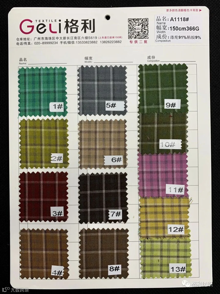 感谢您关注广州新格利®纺织 ,我公司专业从事面料生产开发,TR色织格条,素色小香风,TR双色乐丽丝系列。欢迎广大客户前来咨询采购!地址:广州市海珠区中大新长江北区三楼N3183。☎️电话020 89999234 手机:13826223882