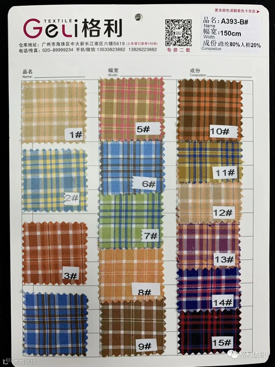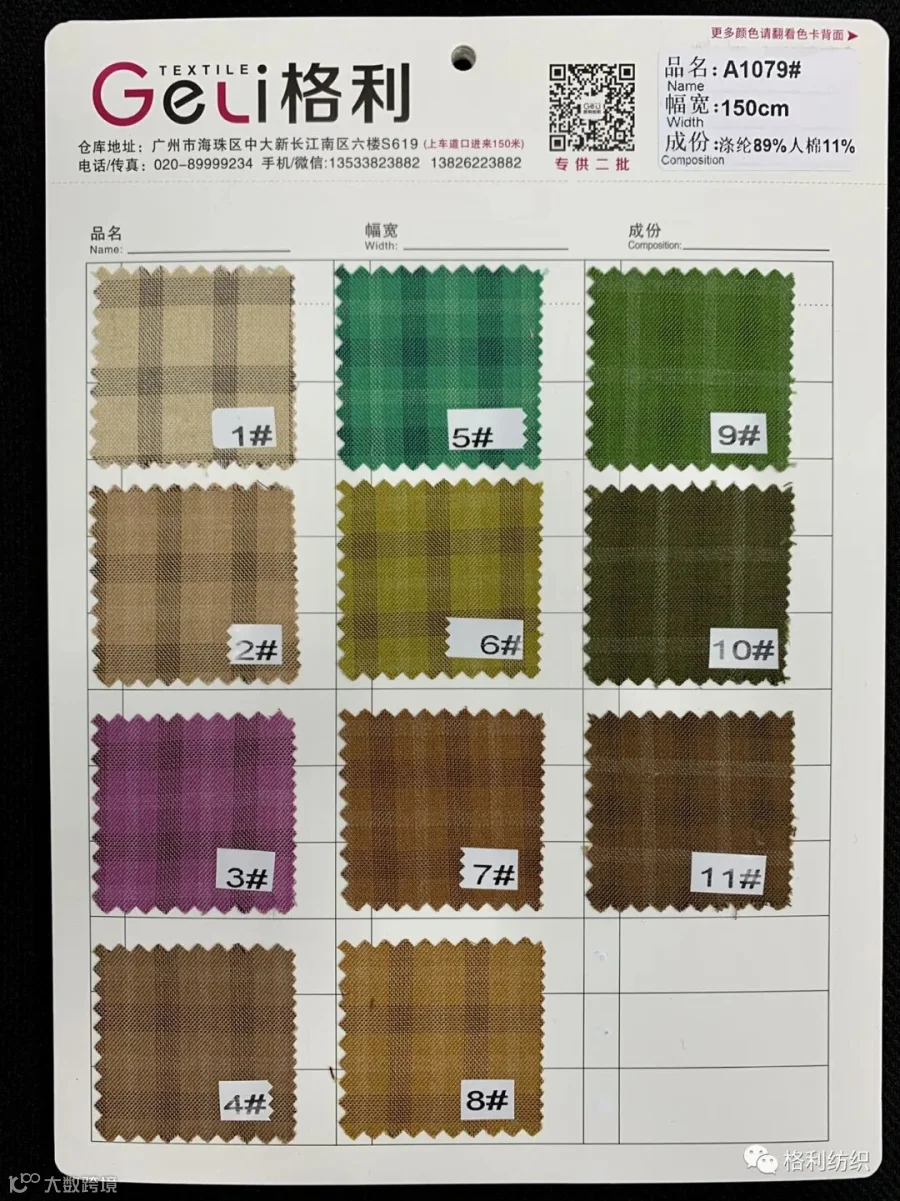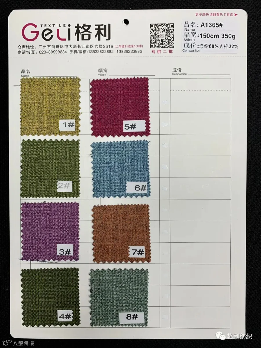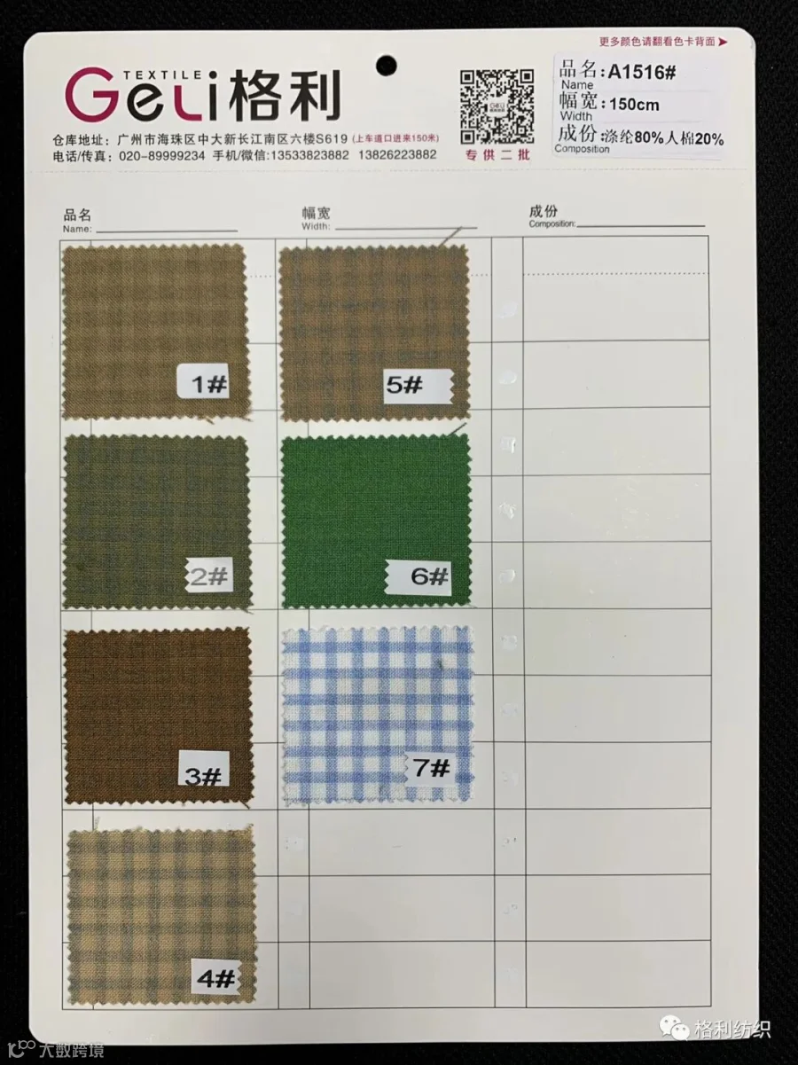 感谢您关注广州新格利®纺织 ,我公司专业从事面料生产开发,TR色织格条,素色小香风,TR双色乐丽丝系列。欢迎广大客户前来咨询采购!地址:广州市海珠区中大新长江北区三楼N3183。☎️电话020 89999234 手机:13826223882