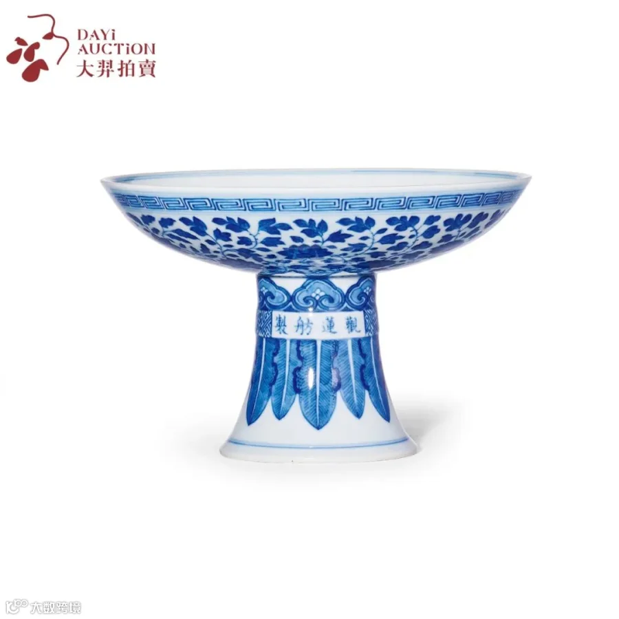 拍品撇口,浅腹,高足外撇。通体以青花为饰,自上而下分别饰回纹、缠枝莲纹、如意纹、蕉叶纹,层次分明,主体突出。于胫部以青花书“观莲舫製”四字单行楷书款。整体造型规整,青花发色淡雅,纹饰布局疏密有致,为道光御窑堂名款佳器。