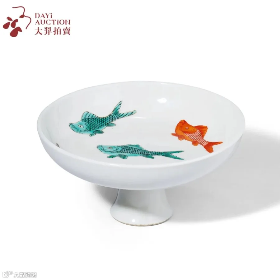 拍品撇口,浅弧腹,平底,高足,器型规整。洗胎质紧致,釉色洁白,盘心以五彩装饰,绘五鱼纹饰,色彩淡雅恬静,体态肥腴,描鳞勾腮,灵动自如,富具动感,呈色自然稳定,施彩妍丽,优美雅致。“鱼”谐音“玉”,寓意金玉满堂。