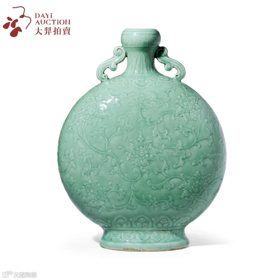 乾隆时期的器物量多质精,器型新颖,胎骨精细,纹饰华丽,既有仿古之气,又有工细新巧的本朝特点,一如本品。此瓶造型秀美,纹饰华美,搭配粉青釉釉色,色泽青绿淡雅,釉面光泽柔和。清代景德镇继承龙泉青瓷的优良传统,烧出了深浅不一的各类粉青釉瓷器,雍正时达到了呈色均匀、稳定的烧造水平,乾隆时期製作技术更为成熟稳定,对于颜色控製自如,拍品釉色所成静若青空,成色素雅匀净,实得文人雅致淡然旨趣。