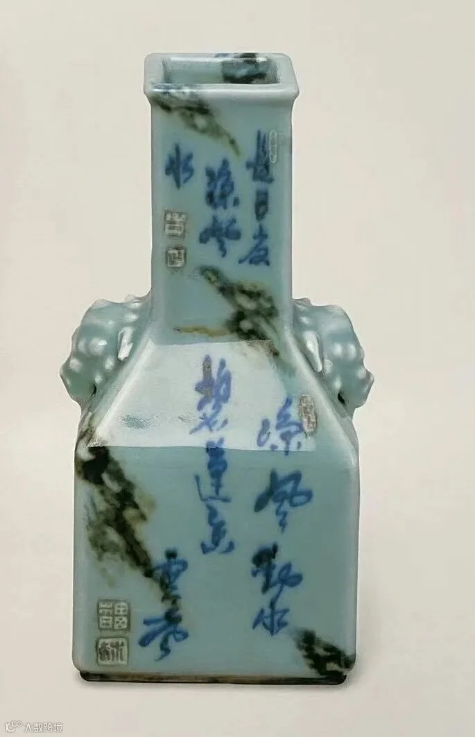 附图:北京颐和园藏 清乾隆 冬青釉青花加紫提字方壶