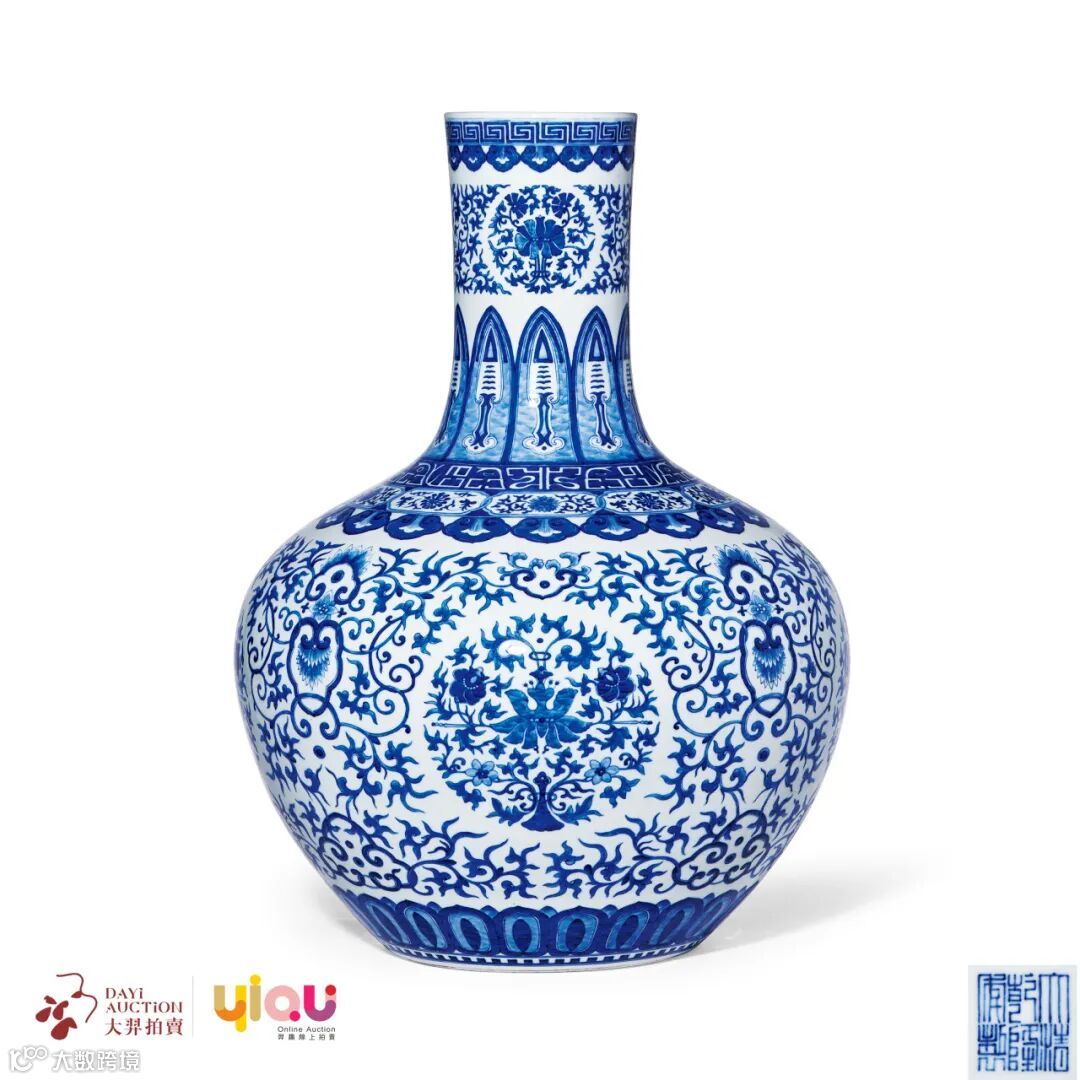 此器轮廓饱满,线条优美圆润,造型端庄稳重,胎骨细白莹润,青花发色浓淡相宜。通体白釉为地,釉色纯净温润,底心釉下青花篆书“大清乾隆年制”六字,结构工整。瓶身青花作饰,口沿绘回纹及如意云头纹一周,颈部及腹部以缠枝西番莲及如意纹为主体纹饰,寓意“如意连连”,肩部至颈部纹饰紧凑,向下依次绘蕉叶纹、兽面纹、缠枝花卉纹、如意纹各一周,近底足处绘变体莲瓣纹一周,疏密相间,层次分明。