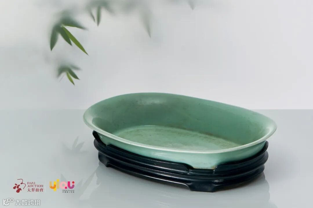 粉青釉椭圆式连座盆古雅隽美,色古而宝光内蕴,质朴而莹润凝厚,魅力非凡,为仿宋器烧成.《陶成纪事碑记》中载“仿米色宋釉,系从景德镇东二十里,地名湘湖,有故宋窑址,觅得瓦砾,因仿其色泽款式。粉青色宋釉,其款式色泽同米色宋釉,一处觅得。"此件粉青釉色泽青绿淡雅,釉面光泽柔和,釉层可施得较厚,使器物的釉色达到柔和淡雅的玉质感,为青釉中最佳色调之一。