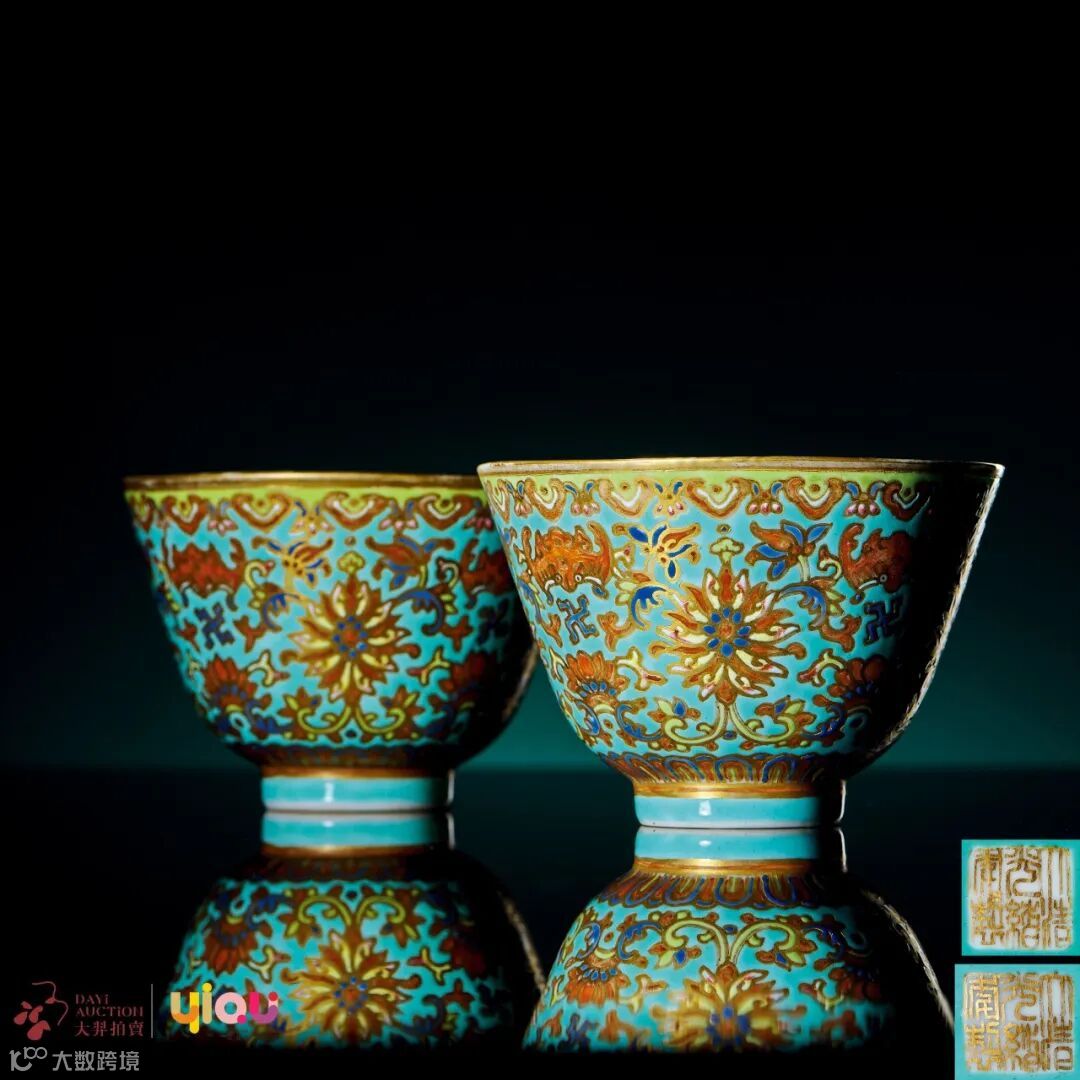 松石绿地粉彩描金福寿莲纹杯一对
