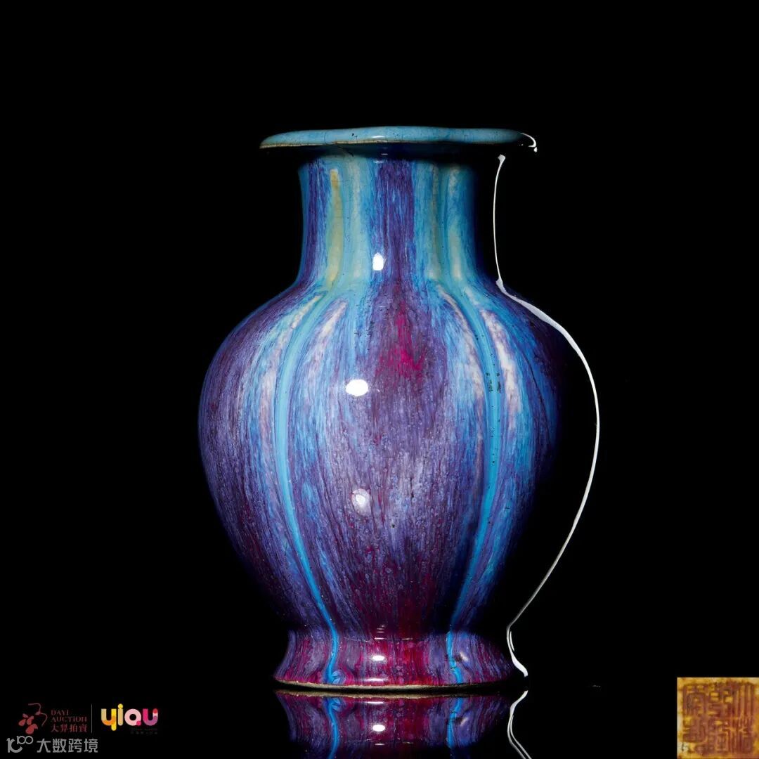 窑变釉为雍正时期创烧的仿宋代钧釉品种,《唐英瓷务年谱长编》中记载,唐英于雍正七年三月,派厂署幕友吴荛圃调查钧窑器釉料配制方法,成功烧制出这一品种,并多次奉命烧造,足见皇帝对窑变釉的偏爱。本品造型端庄,色泽艳丽,独一无二,其窑变釉形态极美,配以具有美好寓意的器形,可谓相得彰宜,尽善尽美。