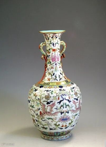 清乾隆 粉彩夔凤穿花纹兽耳衔环瓶