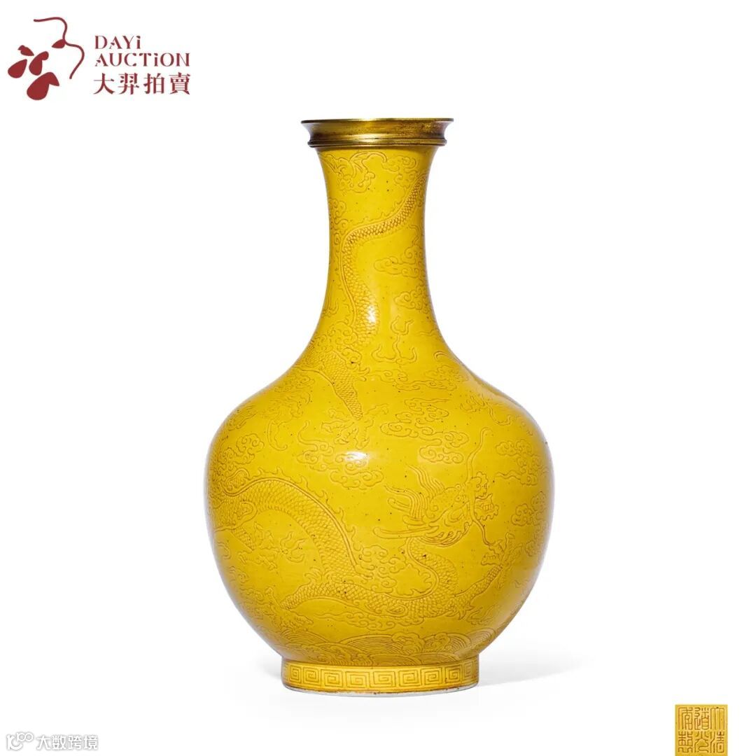 本品腹部绘龙纹威猛霸气,爪劲鳞张,画工生动传神,为道光官窑精品。其爪下江崖海水纹饰为宫廷常见御用纹饰。气势澎湃,有一统江山之意,可见皇权之控力。本品通体御用黄釉装饰,品级极高,如本品之单色釉带刻龙纹者,公司海内外皆存世稀少,见之寥寥。