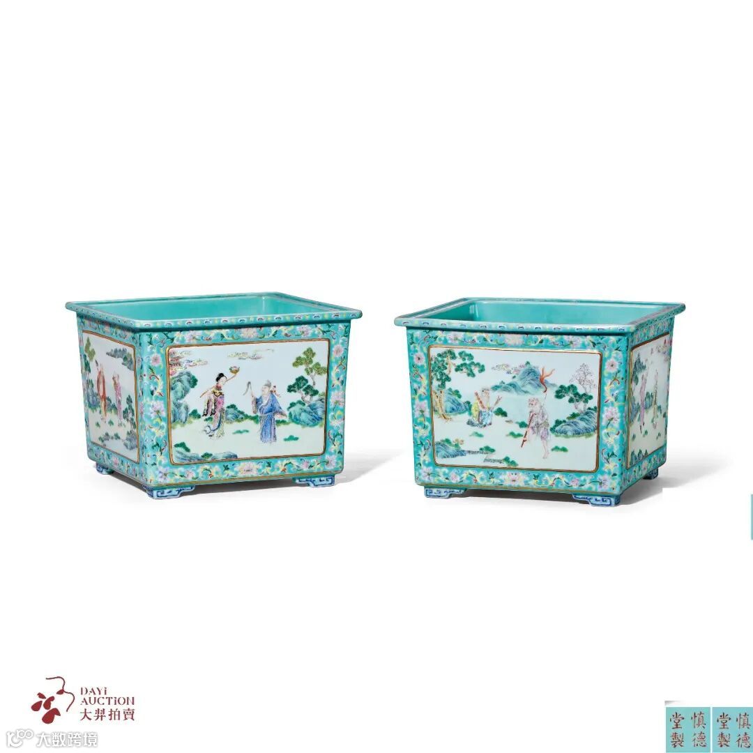 松石绿地粉彩开光八仙图四方花盆一对