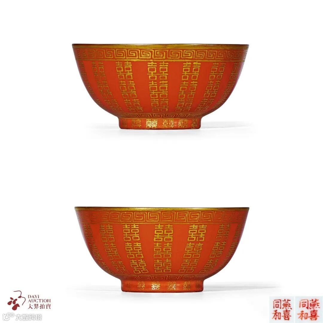 珊瑚红地描金喜字纹碗一对