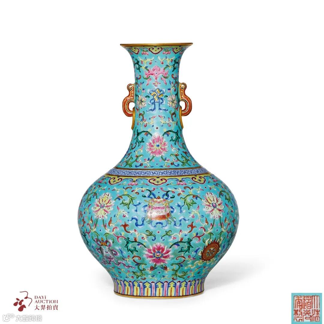松石绿地粉彩缠枝莲托八吉祥纹双耳瓶