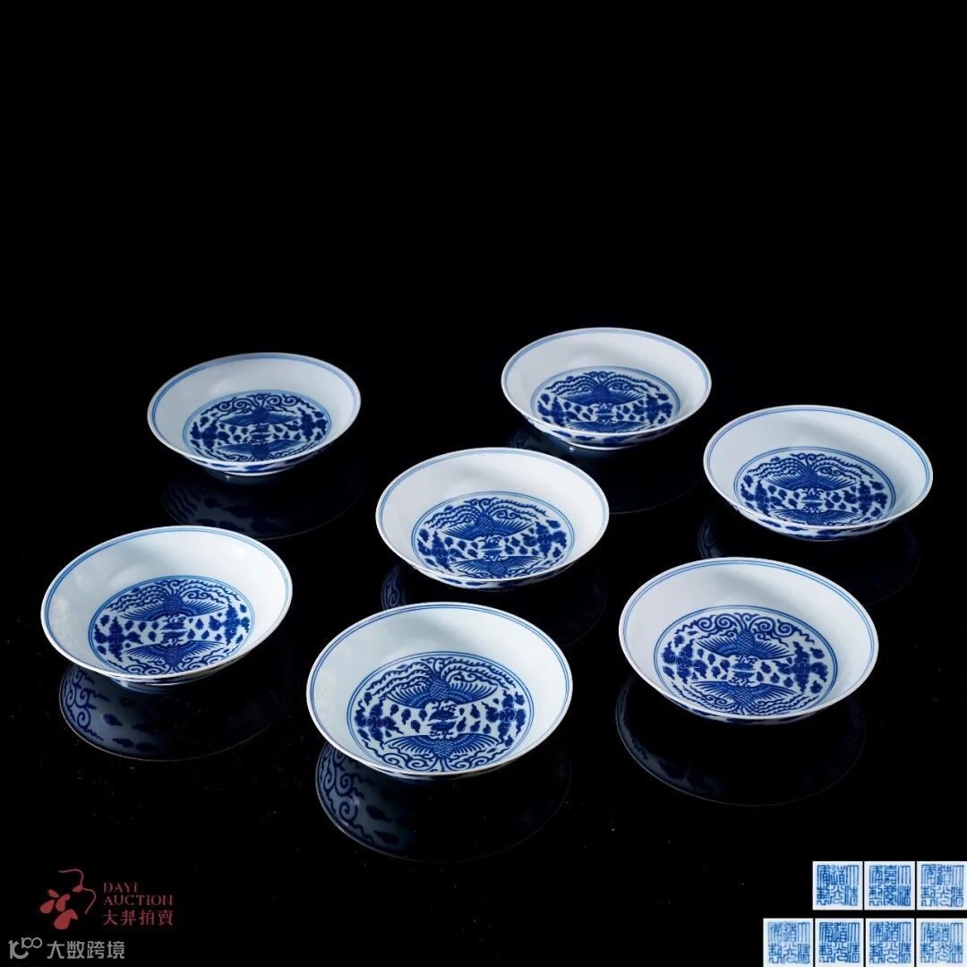 青花对头凤纹盘一组七件