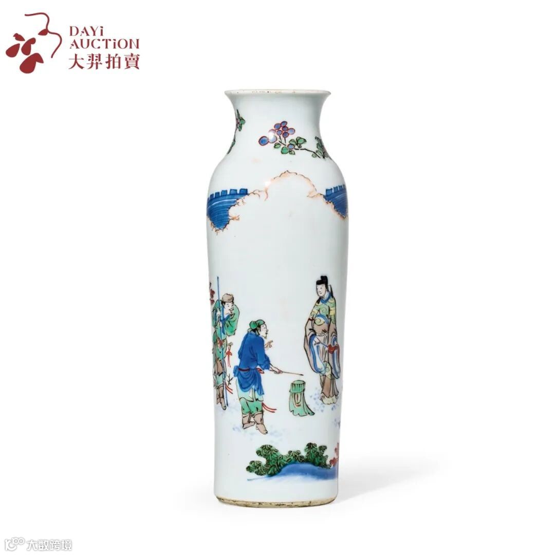 本品为清初青花五彩筒瓶,画面取材于明代戏曲家张凤翼的传奇名作《红拂记》。该剧以隋末风尘三侠——李靖、红拂女与虬髯客的乱世际遇与家国情怀为核心,唱词中“女中丈夫,不枉了女中丈夫;人中龙虎,正好配人中龙虎”一句,正生动勾勒出红拂女慧眼识英、勇于冲破桎梏的非凡形象。