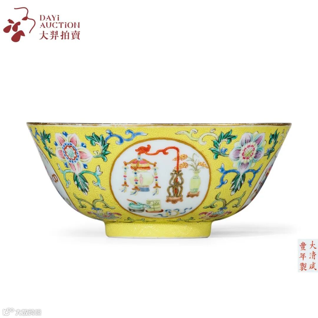 本品与前朝所製“五谷丰登洋彩红地珐琅瓷碗”有所不同,外壁以黄釉为地,施以轧道工艺。上饰洋彩西洋花卉,四面金彩绘圆形开光,开光处绘製博古图,如意、宝瓶、四季花卉、宝鼎、五谷、灯笼等吉祥图案寓意“五谷丰登”、“四季平安”、“吉庆有余”。