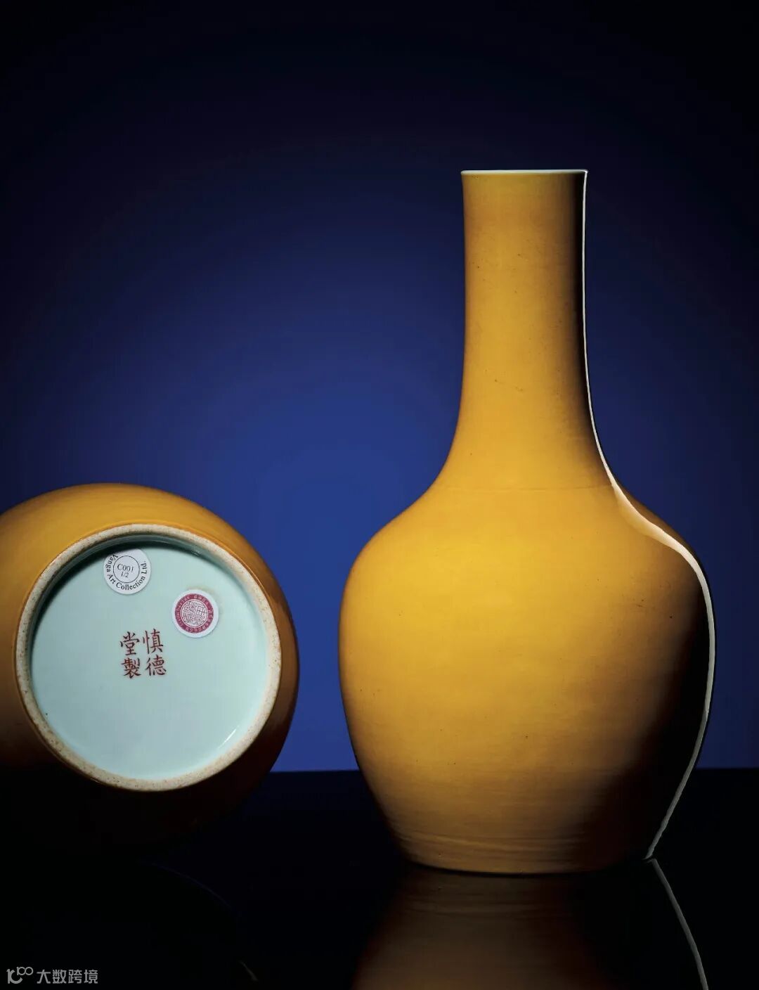 瓷器上纯正的黄釉始于明永乐年间,以后各朝均有烧製,为明清皇家御用,任何人不得僭越。此“娇黄纸槌瓶”成对入贡,今存一对,更显珍贵。