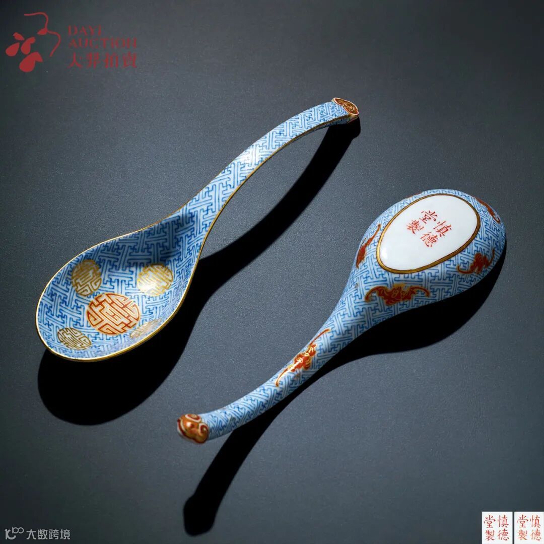 此对匙长弯柄,椭圆形勺池,柄端呈如意云头状。内外以蓝料彩绘“卍”字锦地纹,匙内中心以矾红描金绘团寿纹,又以金彩绘四组小团寿纹环列四周;匙底以矾红描金五蝠,中心留白处以红彩书“慎德堂製”四字楷书款。