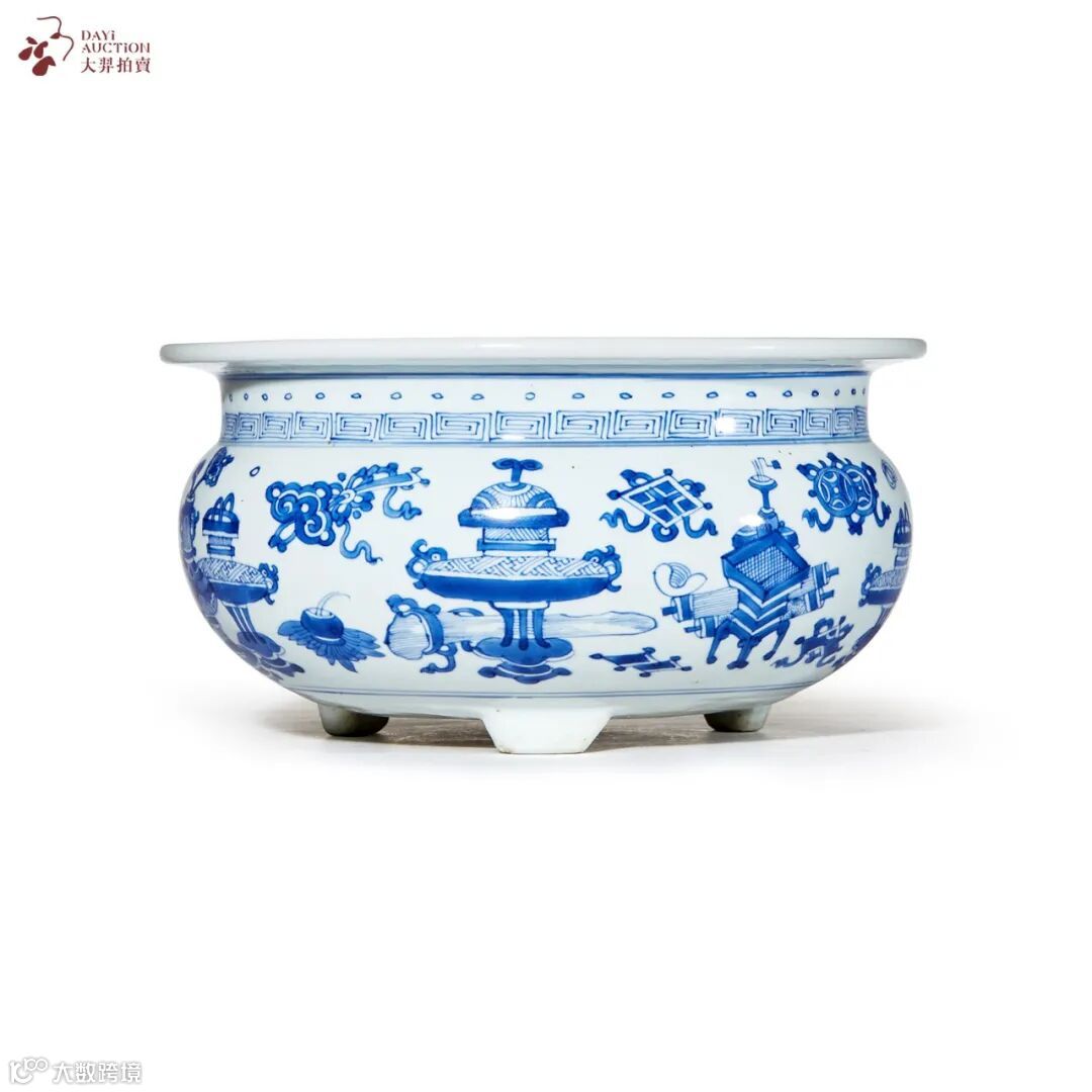 炉折沿,束颈,鼓腹,下承三足,造型端稳,胎体厚重。通体施白釉,釉色皎洁莹润。器身纹饰以青花绘就,外壁自上而下依次绘鼓钉纹、回纹及博古图,香炉、宝鼎、书籍、羽扇等依次罗列,画面一侧设海棠形开光,内绘花蝶纹饰,灵动宜人。博古纹出现于北宋大观年间,宋徽宗命大臣编绘宣和殿所藏古器,修成《宣和博古图》三十卷,后人因此将绘有瓷、铜、玉、石等古代器物的图画,叫做“博古图”。“博古图有博古通今、崇尚儒雅之寓意,常用于书香门第或官宦人家的宅第装饰。