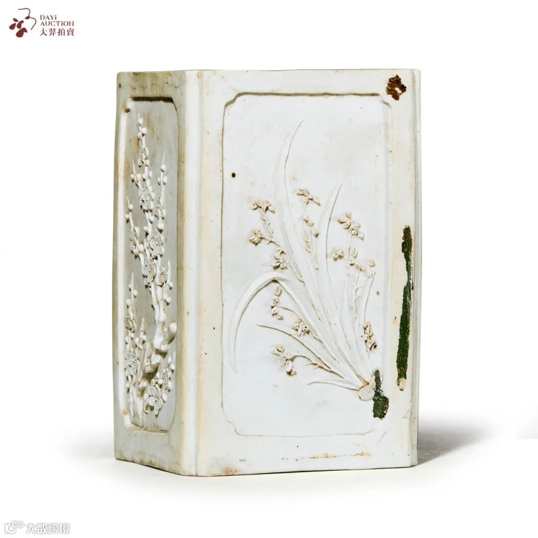 清中期 反瓷开光堆塑梅兰竹菊图笔筒