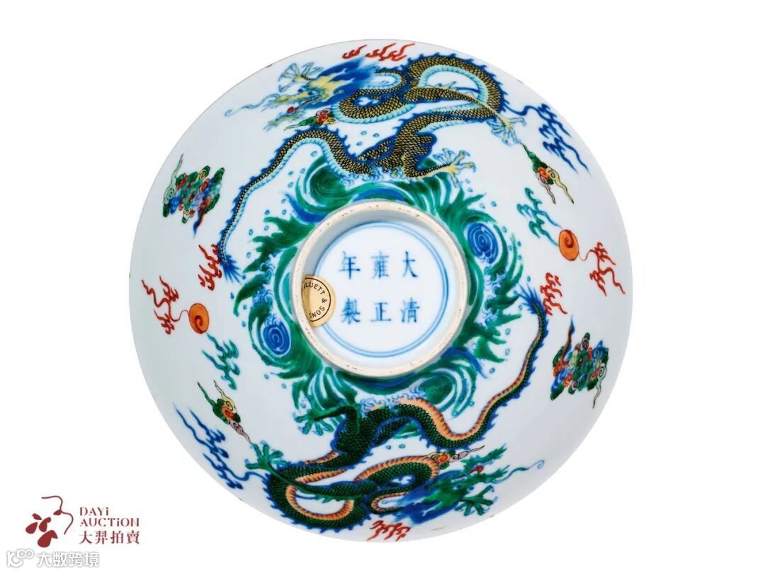 碗内及盖内侧通体施白釉,胎体选用景德镇优质高岭土,胎制规匀端秀、坚致细腻;釉料配比精准,施釉手法娴熟,釉质洁净白润如凝脂,尽显雍正御窑“胎坚釉净”的严苛水准。碗外壁与盖面则以斗彩工艺饰核心纹饰,均绘双龙戏珠纹,一龙以黄彩勾勒填绘,一龙以绿彩施绘,二龙姿态矫健、鳞爪分明,环绕火珠灵动穿梭,气势磅礴;口沿处辅以一周海水江崖纹,再衬以矾红火球、五色云霞,其中火珠以釉上红彩精细描绘,色泽鲜亮,云朵则以五彩分层铺陈,层次丰富。