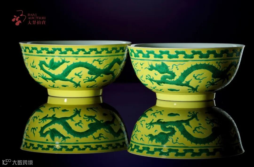 右:天民楼藏 清雍正 柠檬黄地锥拱绿彩云龙纹墩式碗